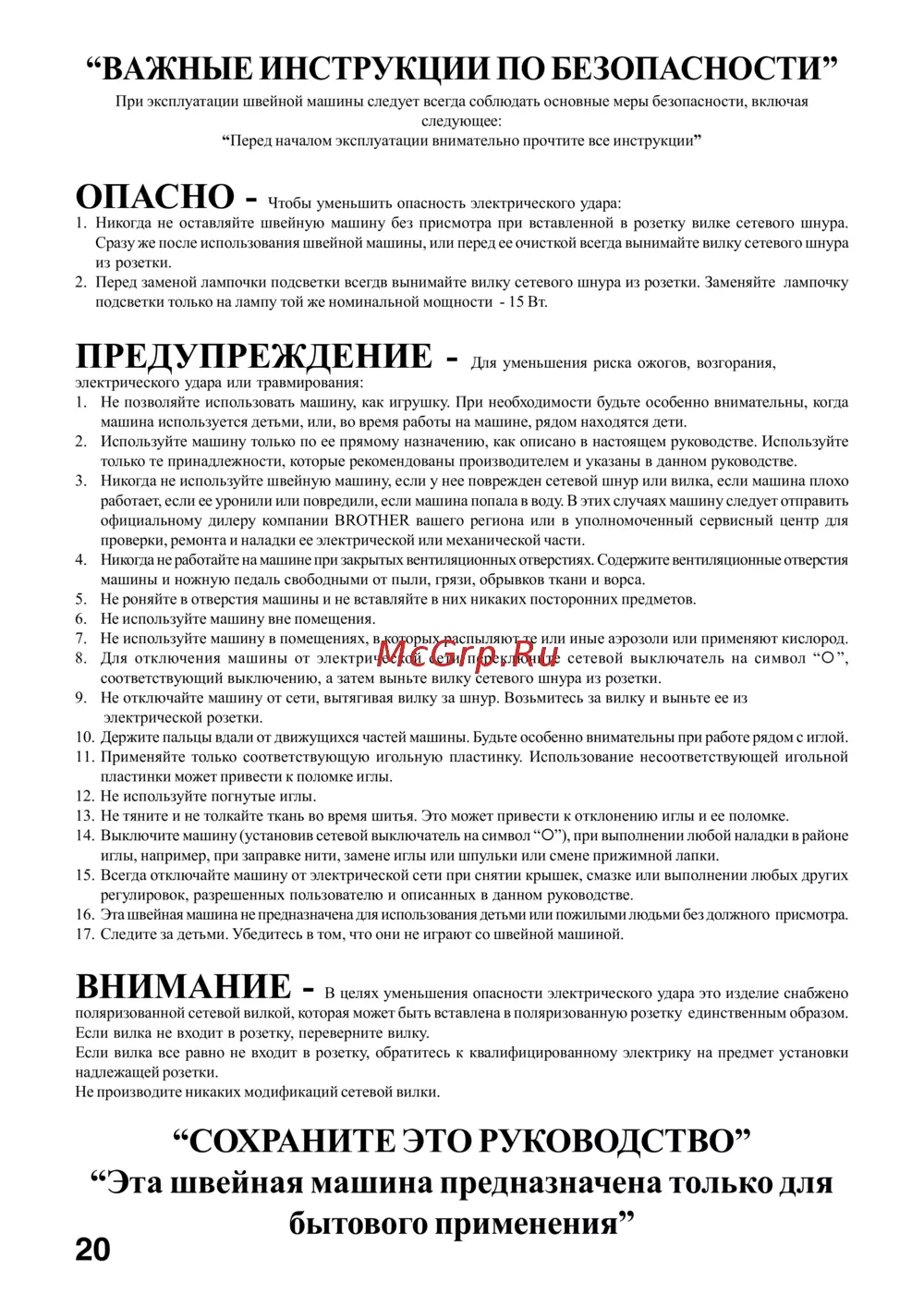 - Ñîõðàíèòå ýòî ðóêîâîäñòâî ýòà øâåéíàÿ ìàøèíà ïðåäíàçíà åíà òîëüêî äëÿ áûòîâîãî ïðèìåíåíèÿ p.2