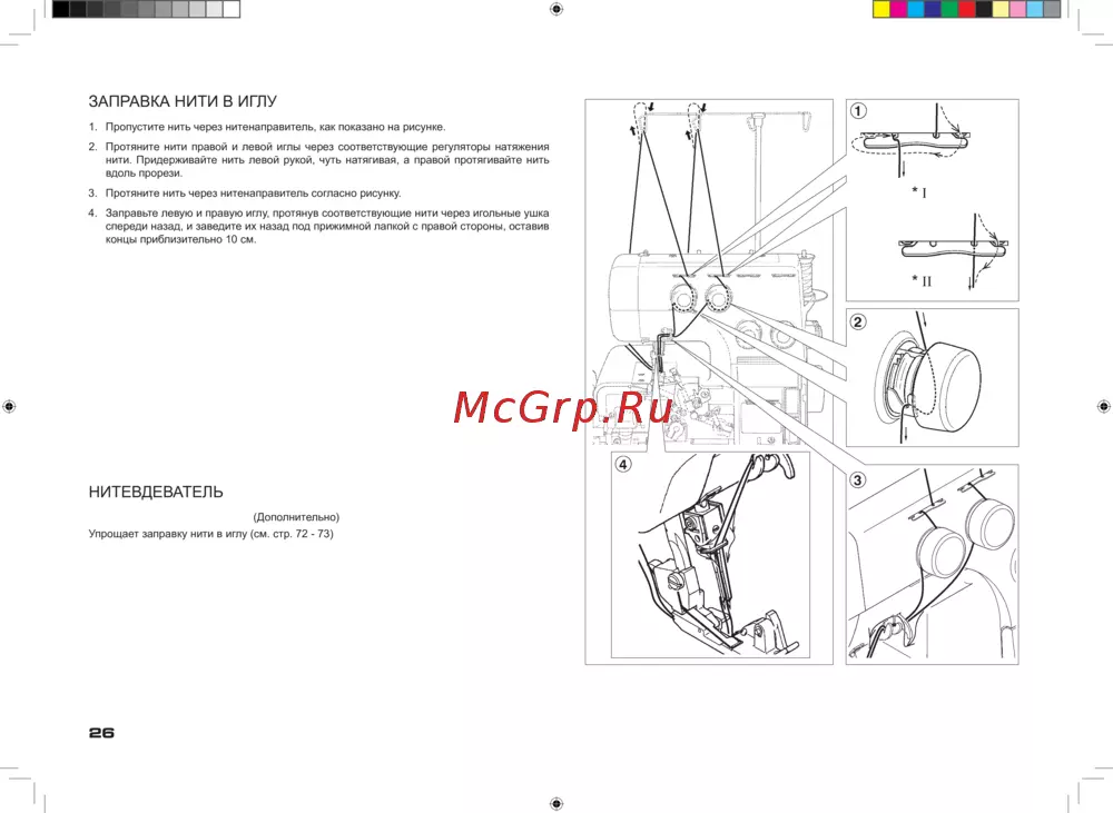 4. Заправьте левую и правую иглу, протянув соответствующие нити через игольные ушка