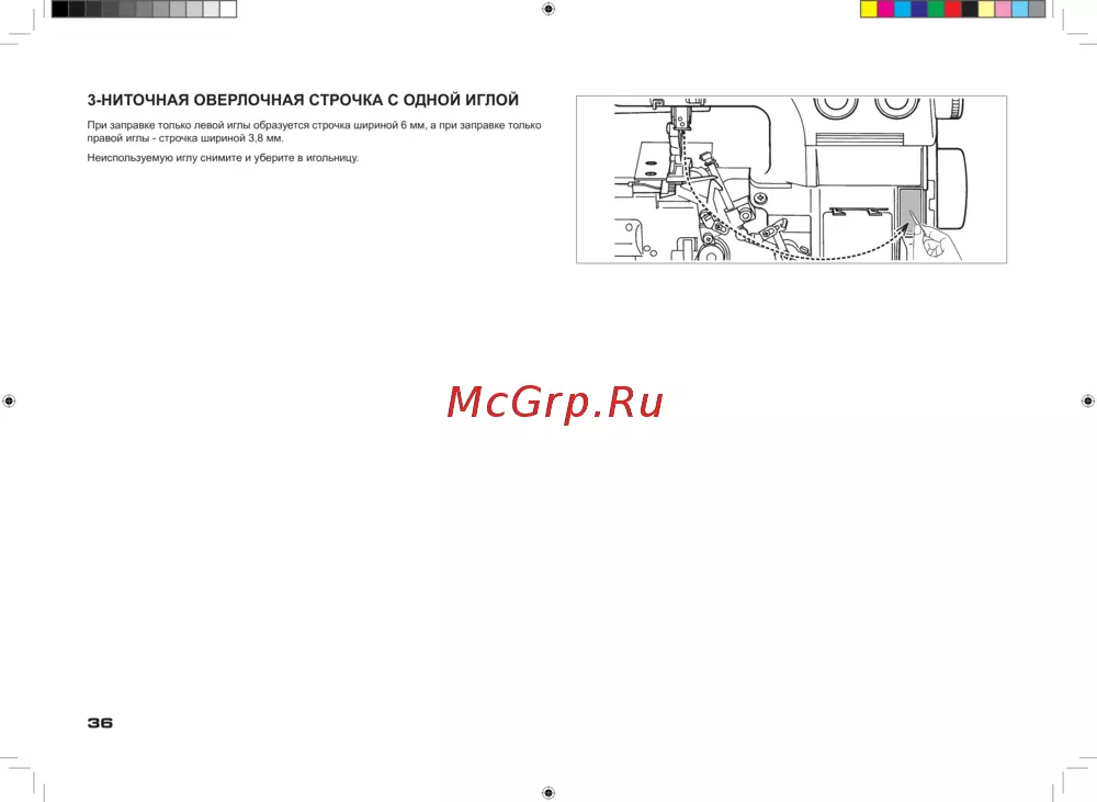При заправке только левой иглы образуется строчка шириной 6 мм, а при заправке только