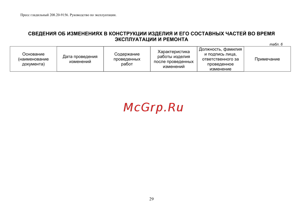 - Сведения об изменениях в конструкции изделия и его составных частей во время эксплуатации и ремонта p.29