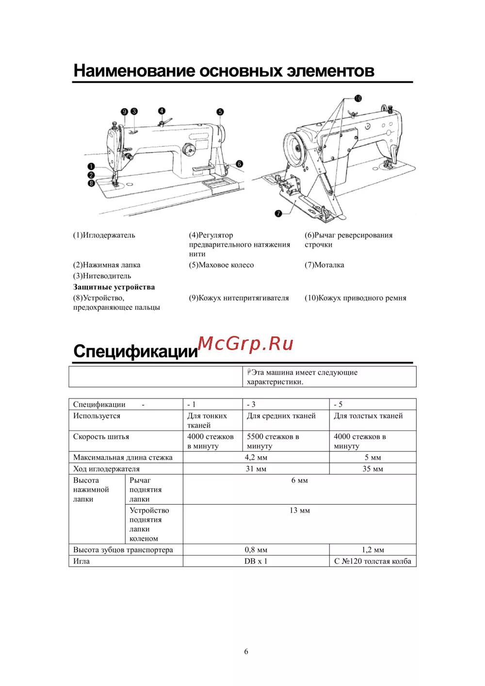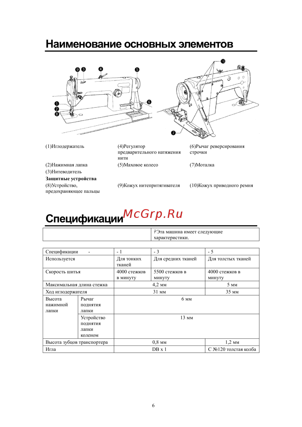 (2)Нажимная лапка (5)Маховое колесо (7)Моталка