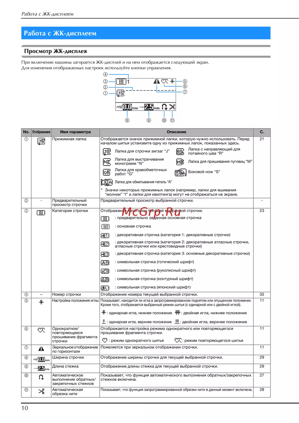 9 Длина стежка Отображение длины стежка для текущей выбранной строчки. 29