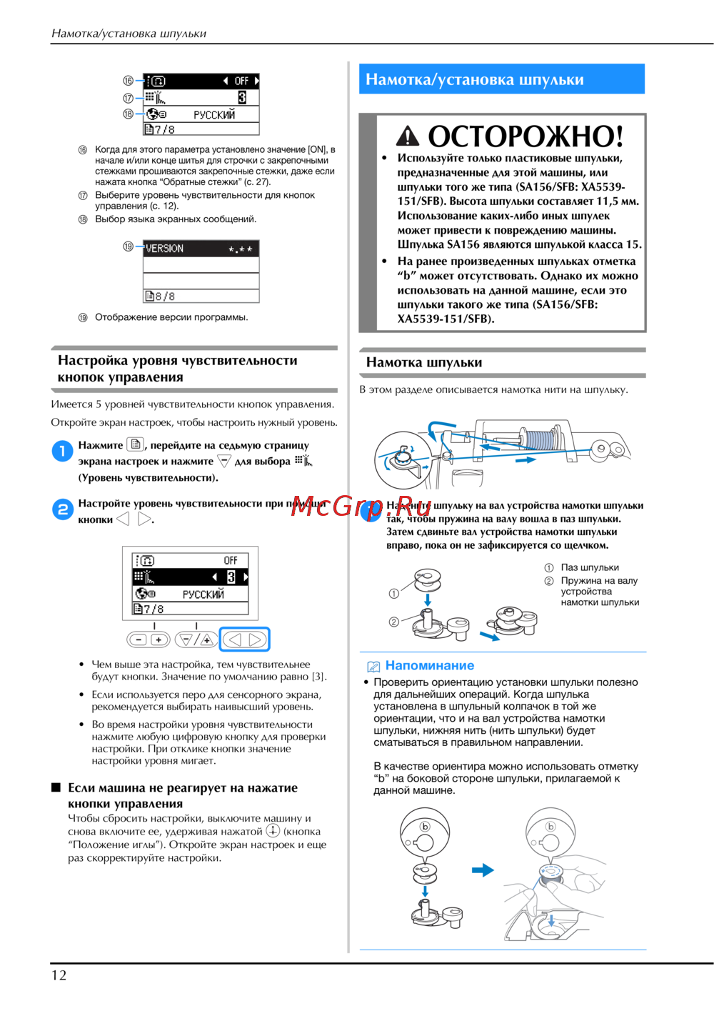 - Убедитесь в правильной установке шпульного колпачка в противном случае возможна поломка иглы p.60
