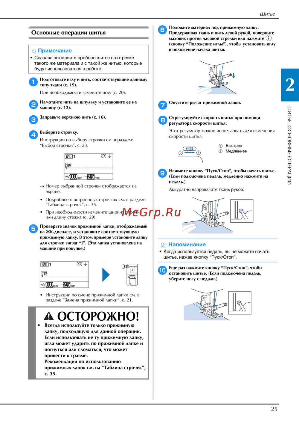 - Убедитесь в правильной установке шпульного колпачка в противном случае возможна поломка иглы p.60