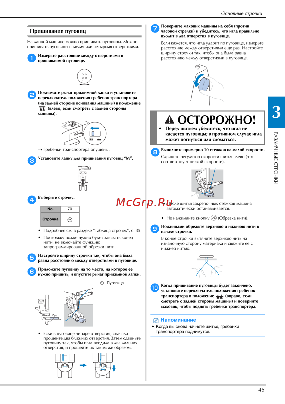 - Убедитесь в правильной установке шпульного колпачка в противном случае возможна поломка иглы p.60