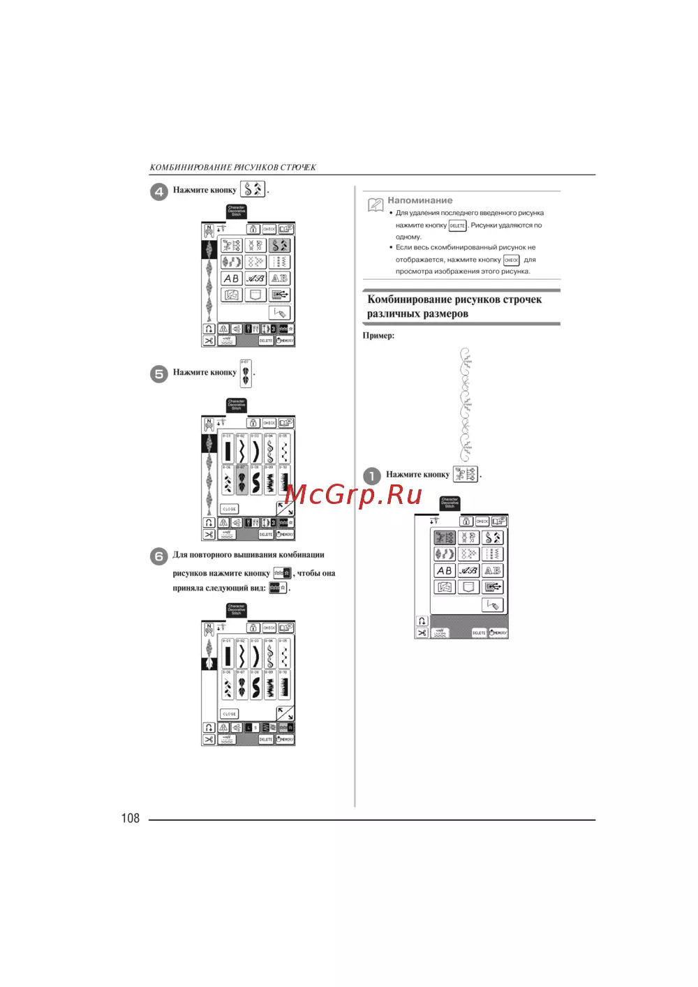 - При необходимости измените такие настройки как ширина строчки и длина стежка p.184
