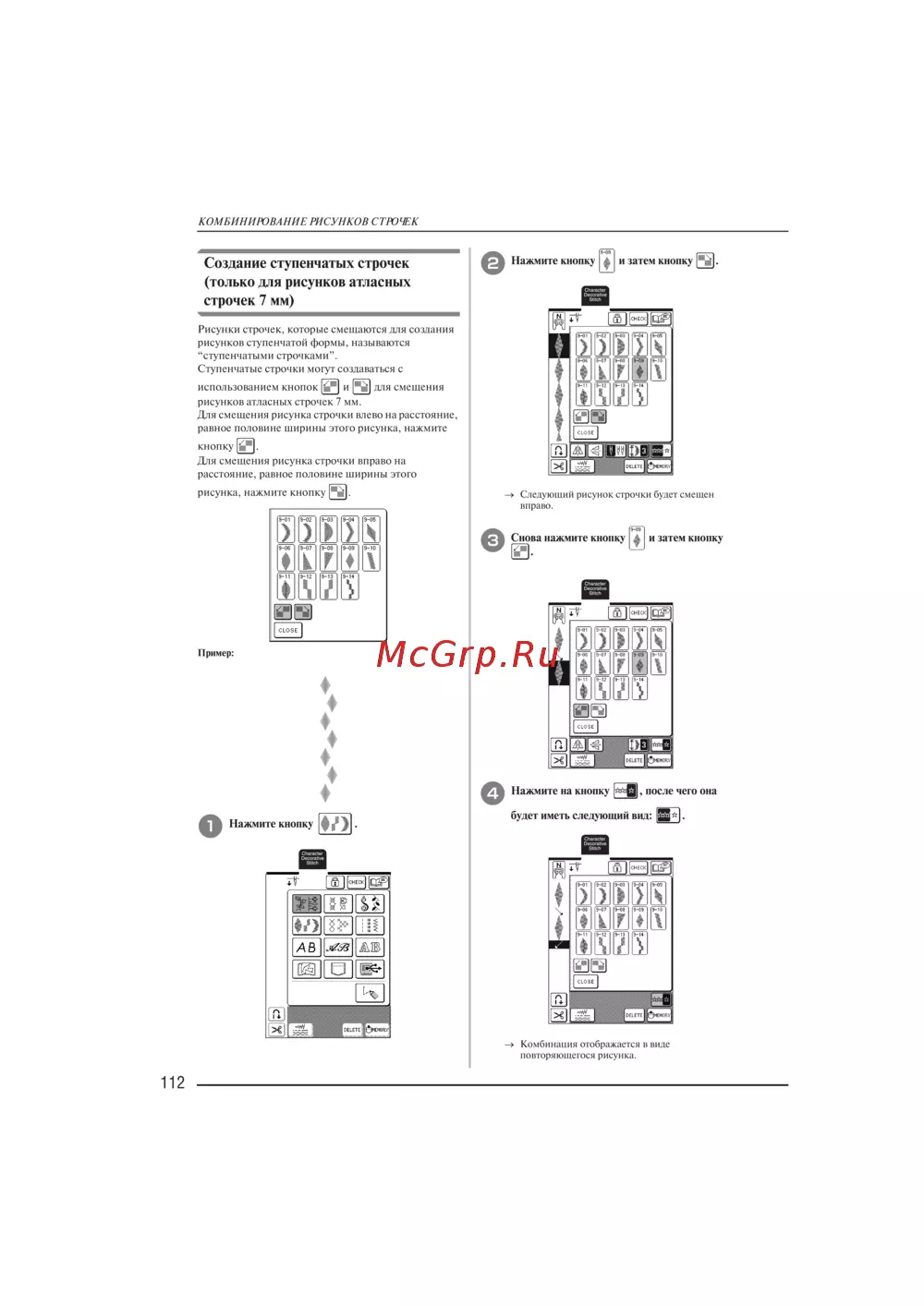 Brother NV 2200 [114/220] Создание ступенчатых строчек только для рисунков атласных строчек 7 мм