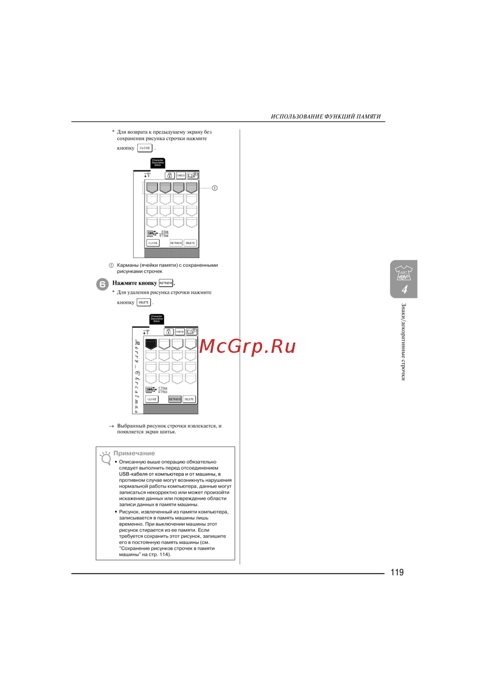 - С помощью прилагаемого usb кабеля подключите швейную машину к компьютеру для того чтобы можно было сохранять строчки в памяти компьютера для получения более подробной информации о сохранении строчек см сохранение рисунков строчек на компьютере на стр 116 p.188