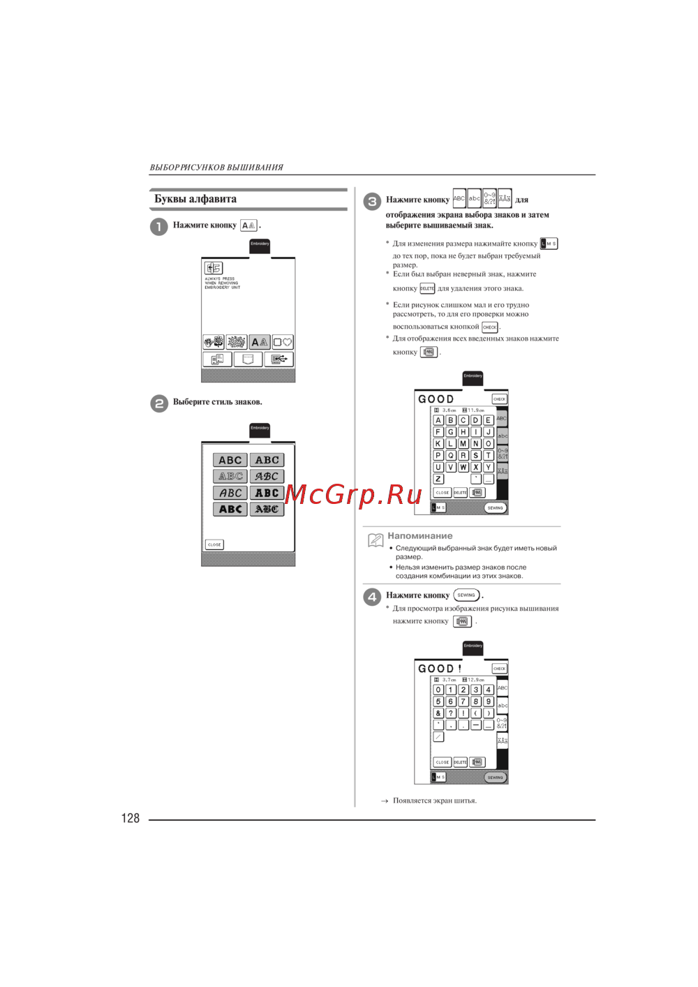 Brother NV 2200 [130/220] Отображения экрана выбора знаков и затем выберите вышиваемый знак