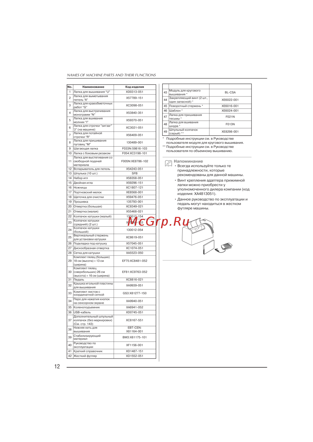 Brother NV A50 (Innov-is)Уведомление о принадлежностях, входящих в комплект поставки