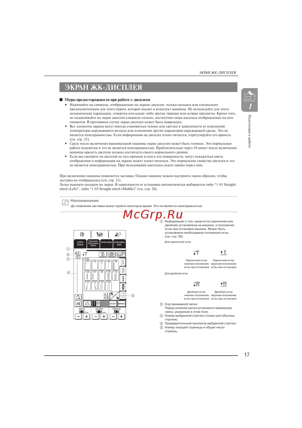 • Сразу после включения вышивальной машины экран дисплея может быть темным. Это нормальная