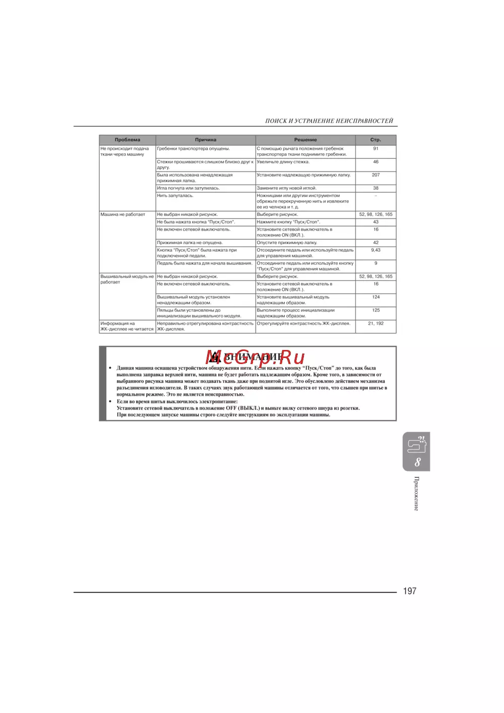 - Если со швейной машиной возникли незначительные проблемы то для их решения просмотрите приведенную ниже таблицу если предлагаемые действия по устранению неисправности не решили возникшую проблему обратитесь к уполномоченному дилеру фирмы p.196