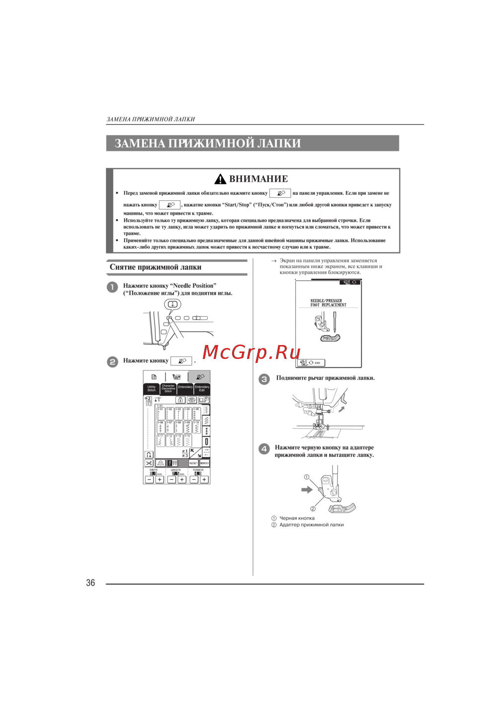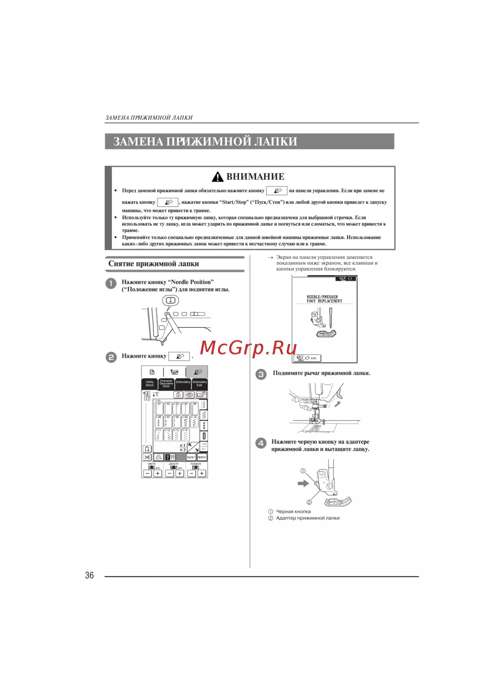 • Перед заменой прижимной лапки обязательно нажмите кнопку на панели управления. Если при замене не