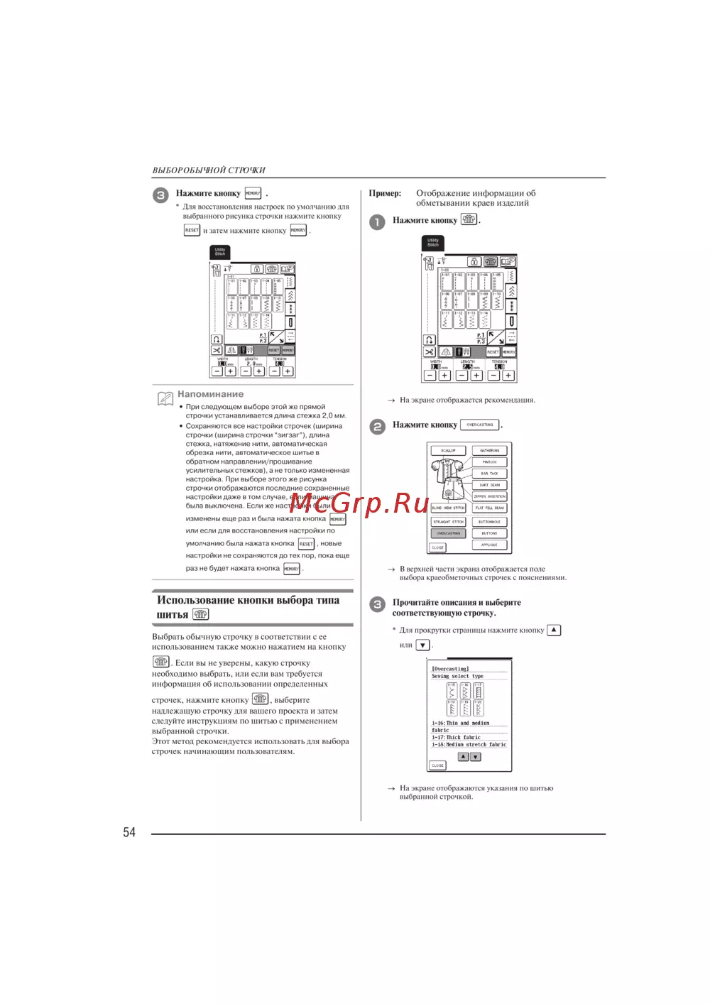 - При необходимости измените такие настройки как ширина строчки и длина стежка p.184