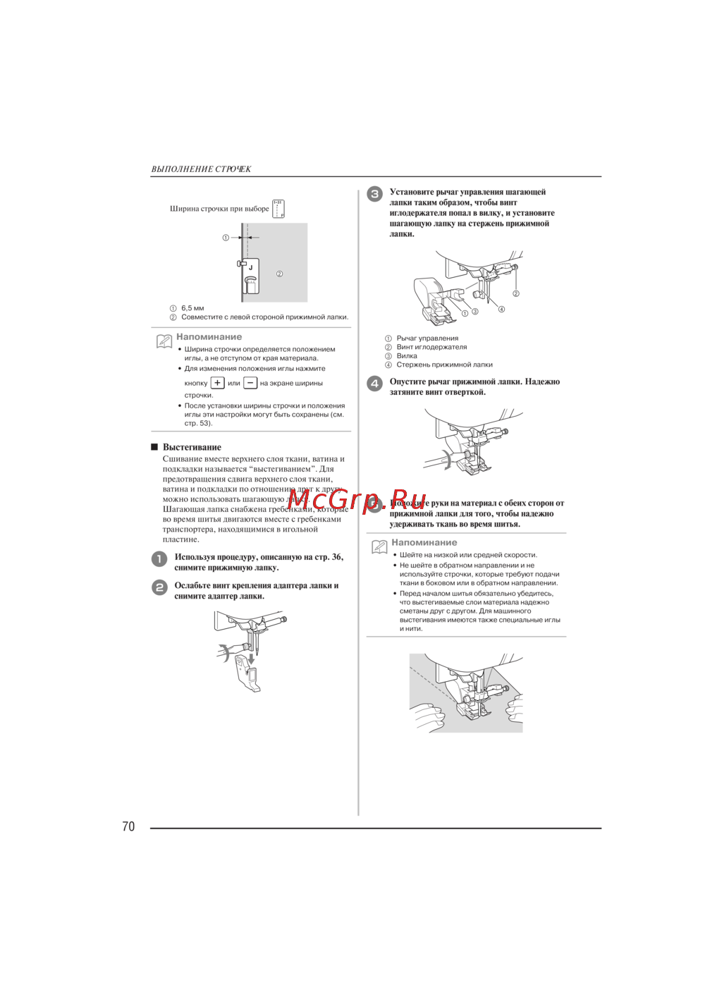 - При необходимости измените такие настройки как ширина строчки и длина стежка p.184