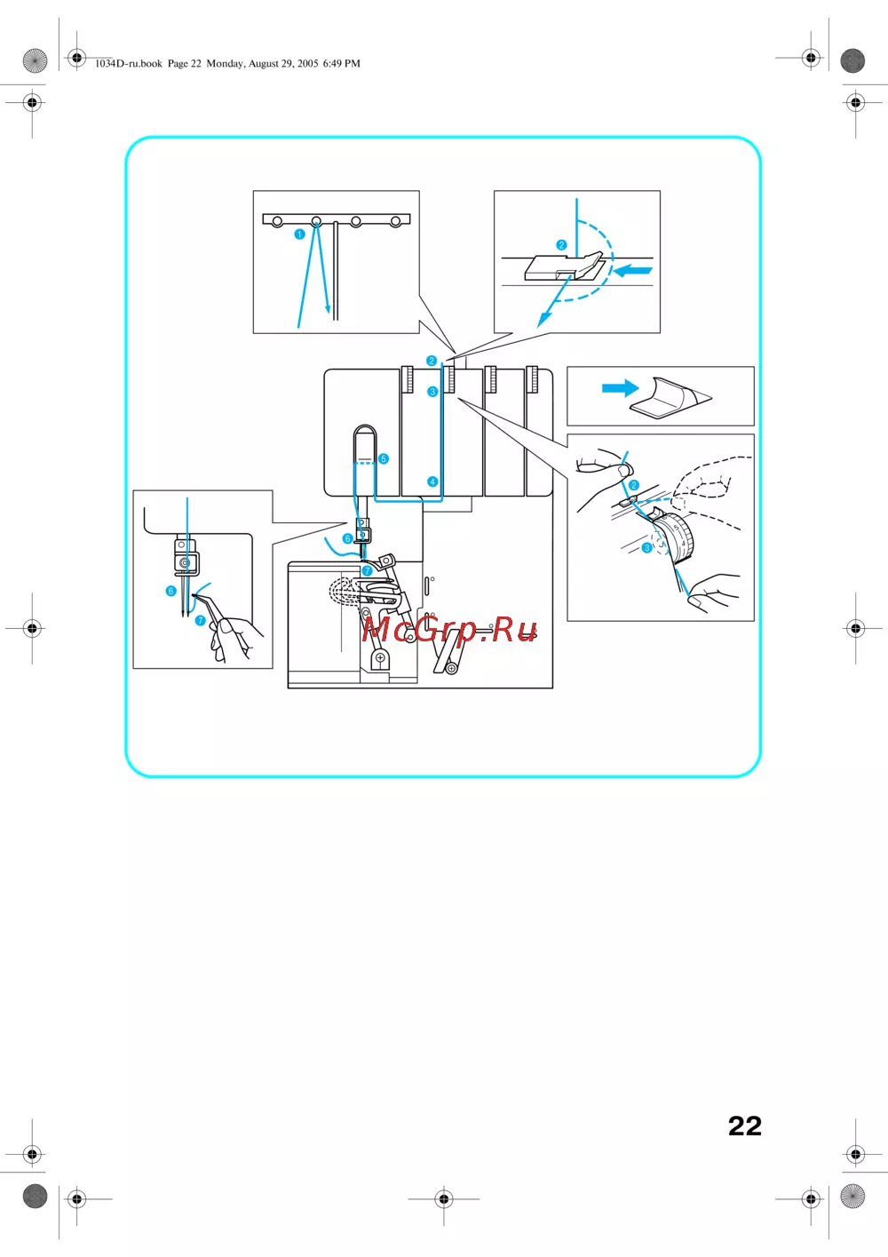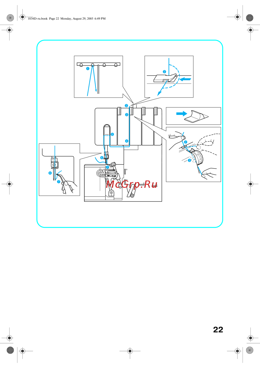 - Пропустите нить в последовательности показанной на рисунке следуя вдоль синей линии в соответствии номерами у каждого узла заправки p.26