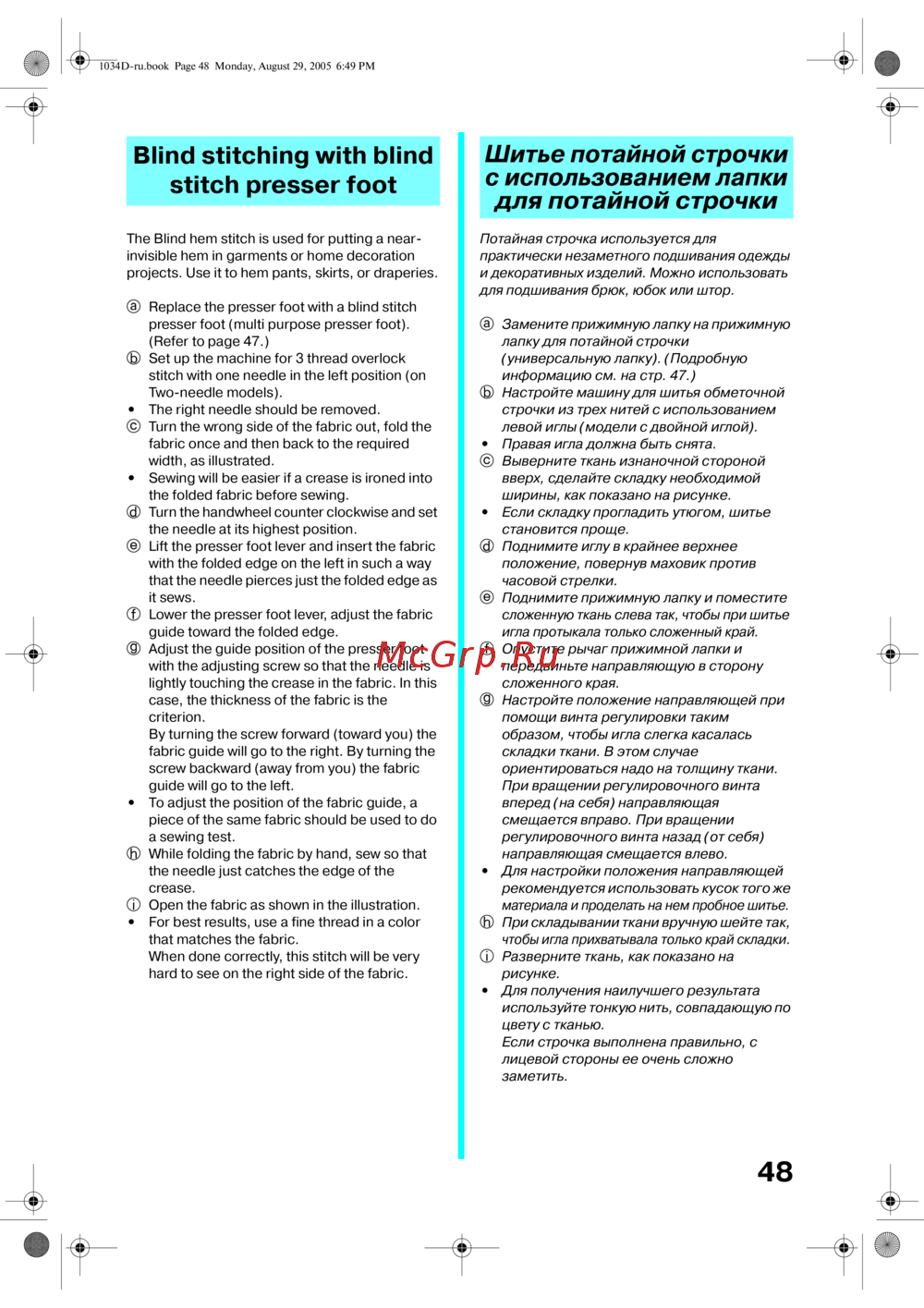 - Стачивание краев с использованием лапки для потайной строчки p.57