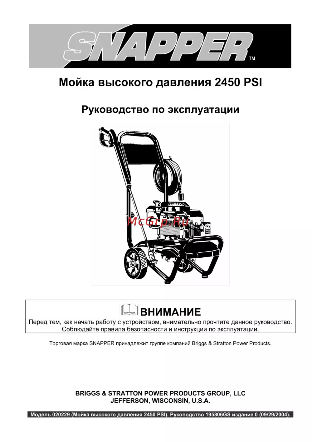 Модель 020229 (Мойка высокого давления 2450 PSI). Руководство 195806GS издание 0 (09/29/2004).