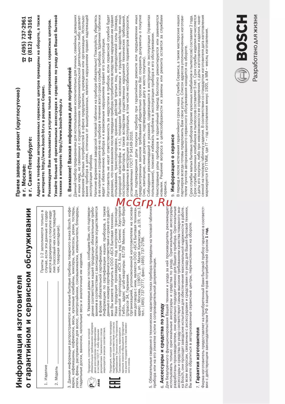 3. Данная информация распространяется на малые бытовые приборы товарного знака Bosch: кофе-