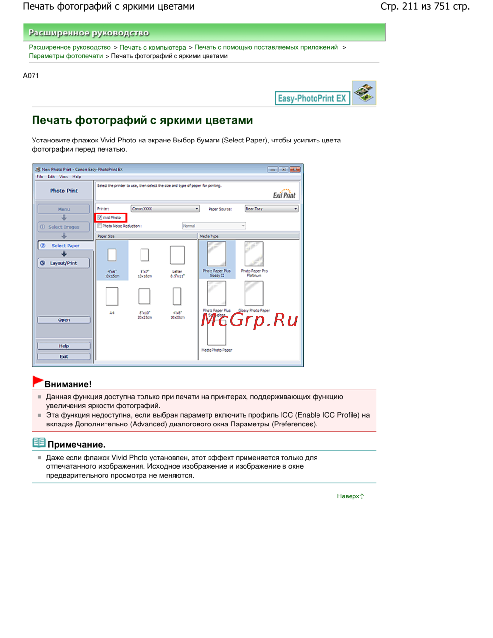 Инструкция по настройке Vivid Photo для улучшения цветов фотографий при печати. Узнайте, как использовать функцию, ее доступность и особенности применения на принтерах.