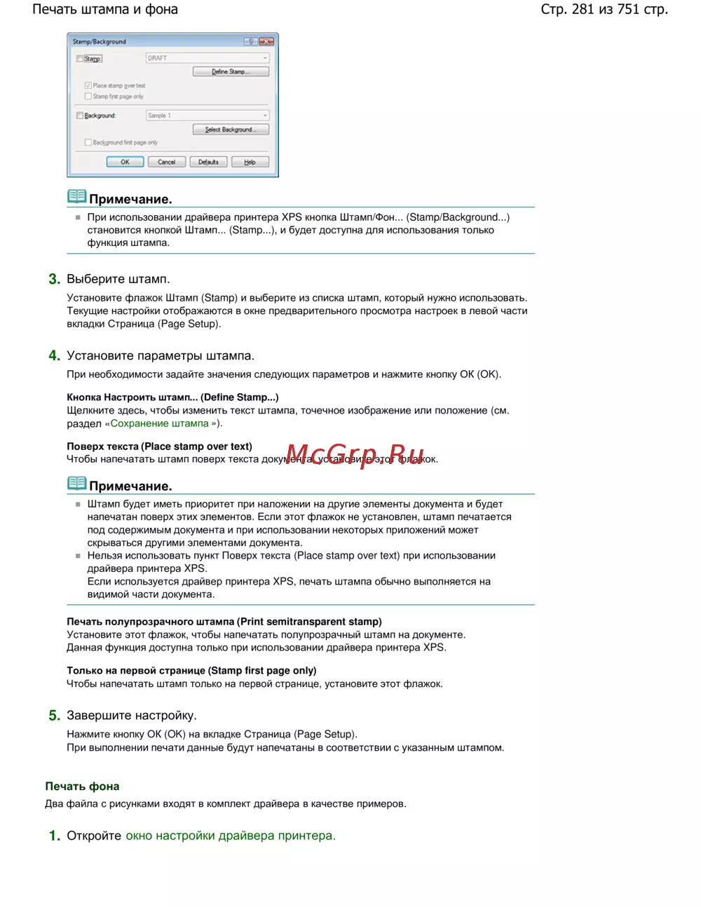Canon PIXMA MP282 — настройка печати штампов и фона в драйвере XPS [281/751]