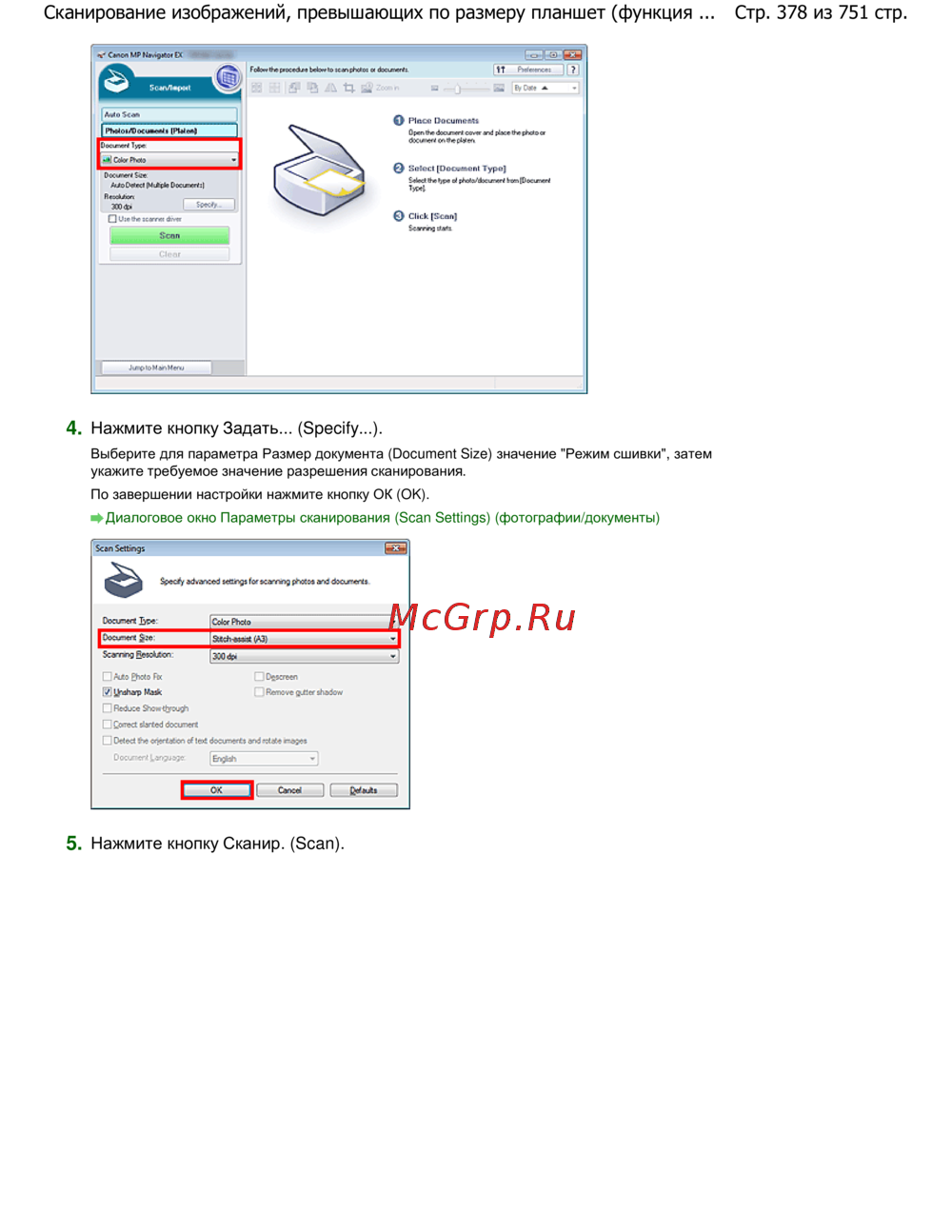 Стр. 378 из 751 стр.Сканирование изображений, превышающих по размеру планшет (функция ...