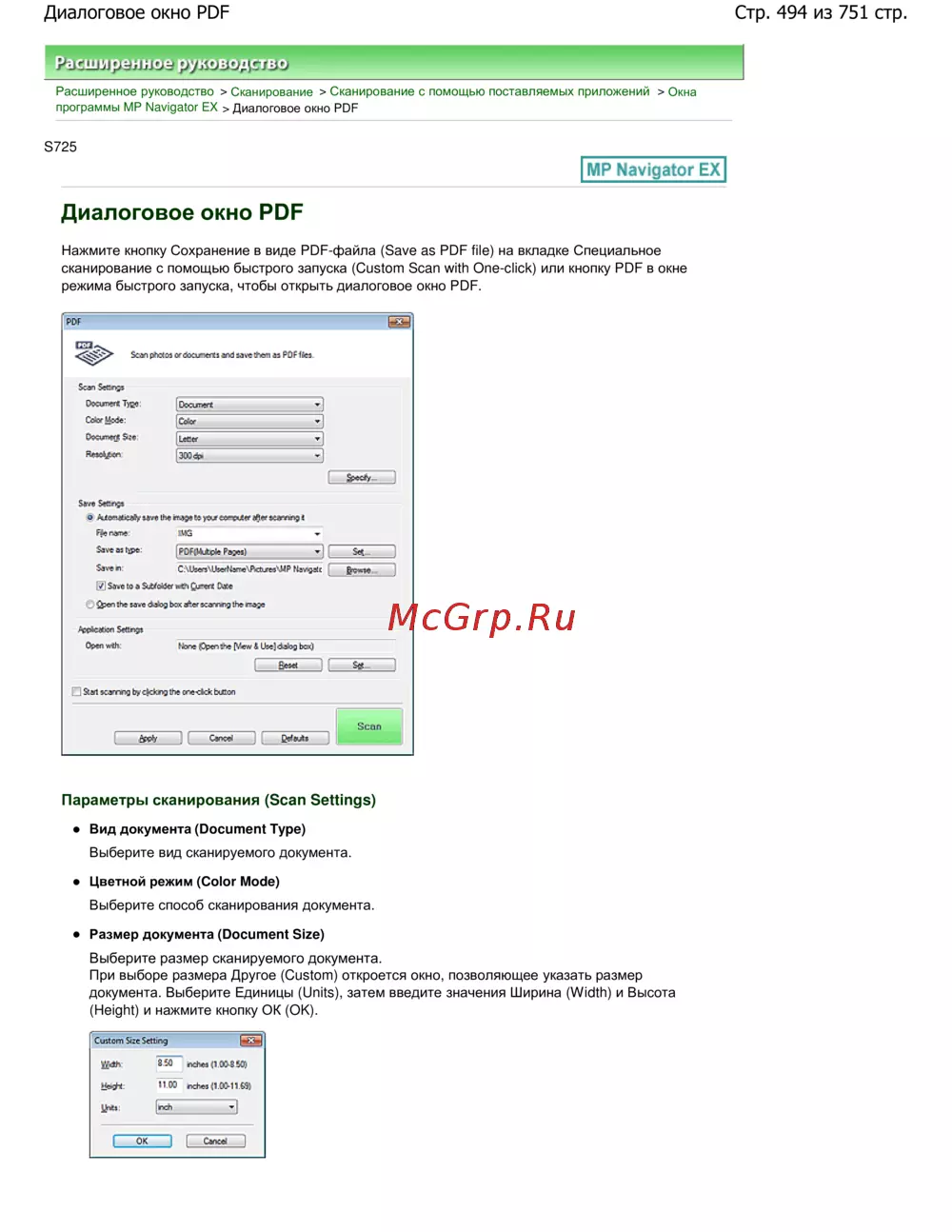 Узнайте, как использовать функцию PDF в MP Navigator EX для сохранения сканированных документов. Настройте параметры сканирования и размеры документов для эффективной работы.