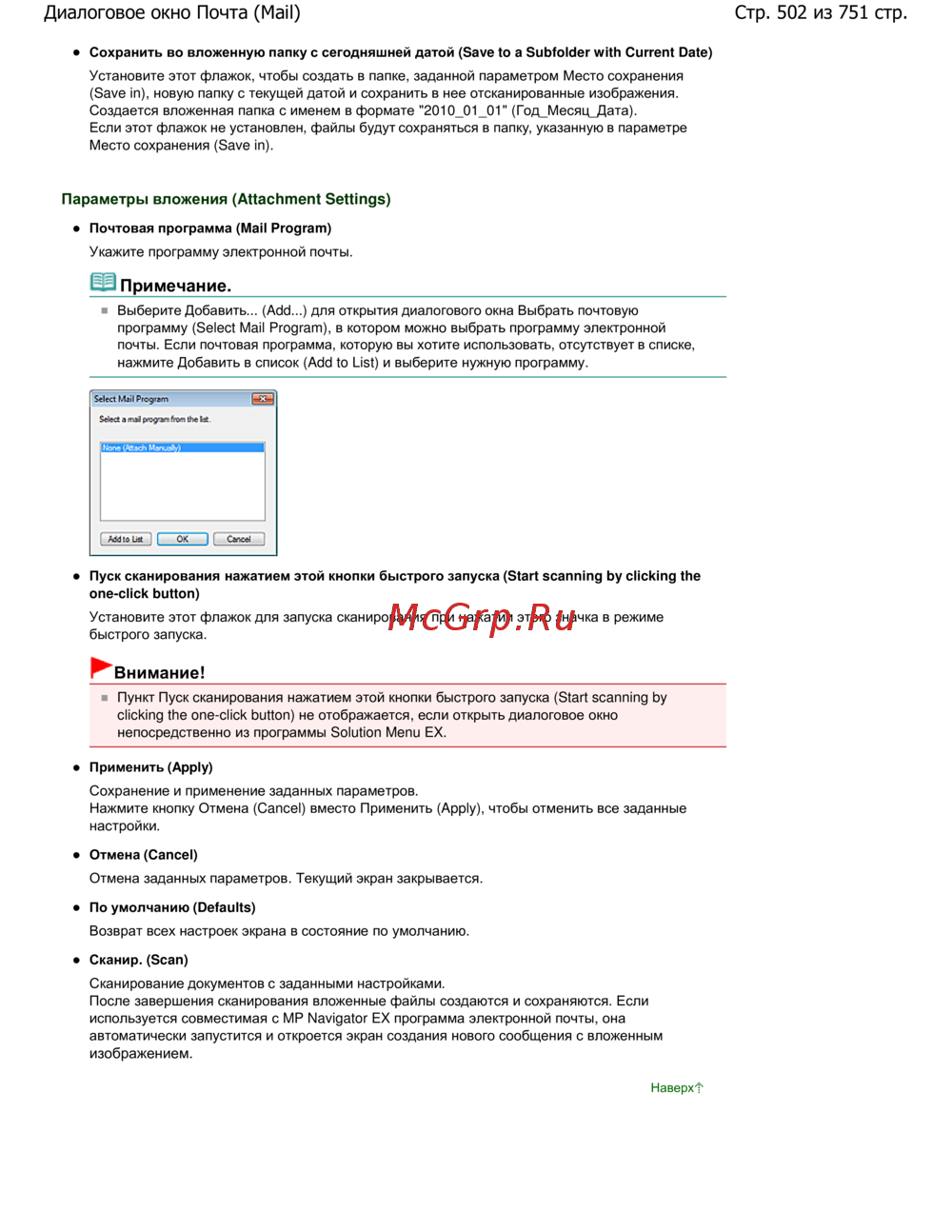 используется совместимая с MP Navigator EX программа электронной почты, она