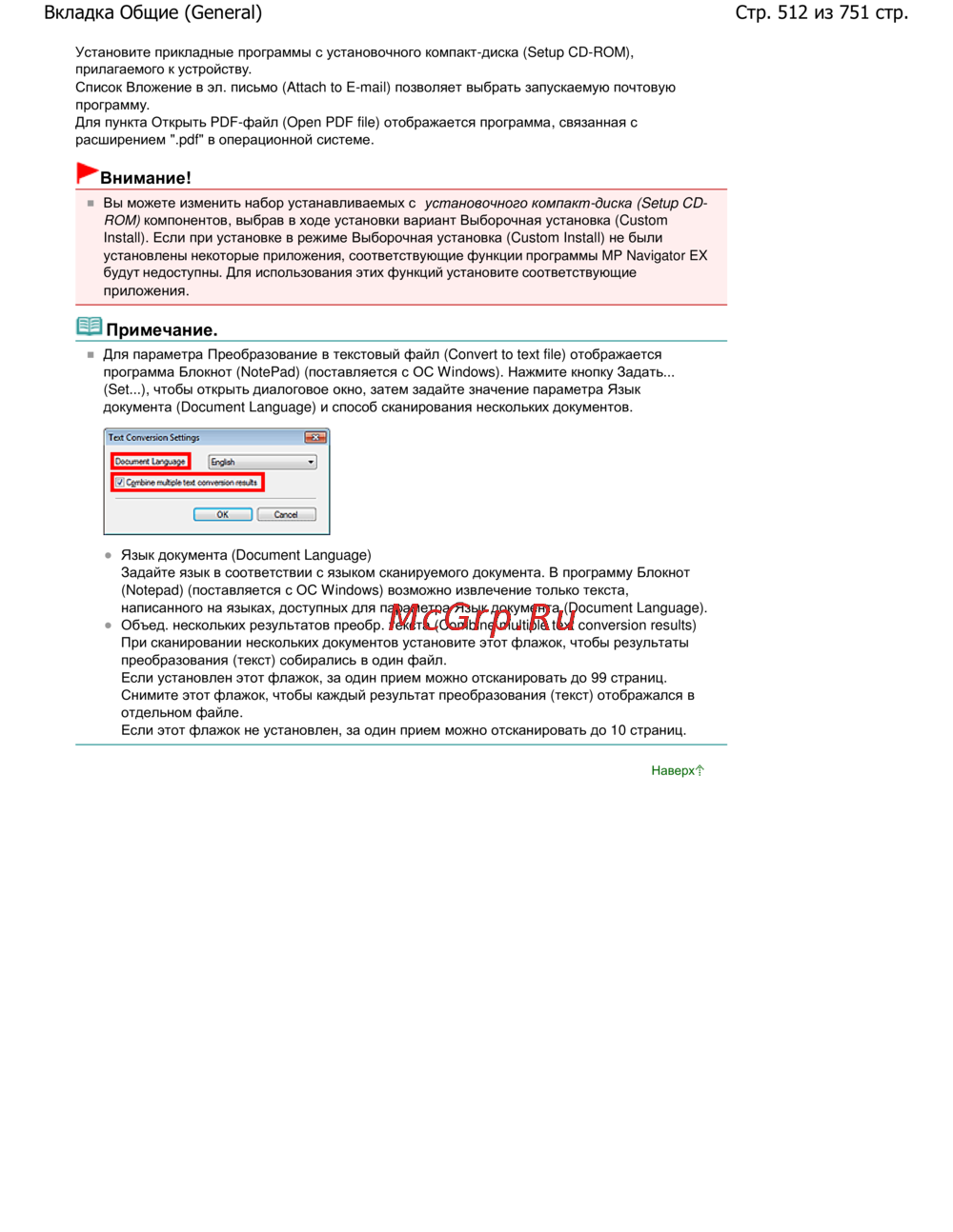 Инструкция по установке ПО с CD-ROM, выбору компонентов, настройке параметров для работы с PDF, преобразованием в текст и сканированием документов. Узнайте, как использовать функции программы MP Navigator EX и настроить параметры.
