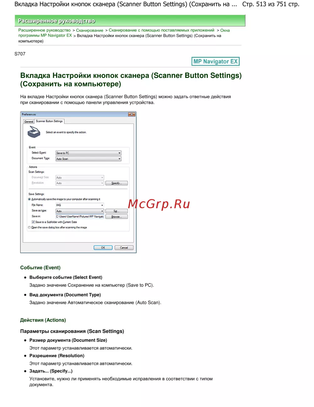 Canon PIXMA MP282 — настройки кнопок сканера MP Navigator EX: сохранение и автоматические параметры [513/751]