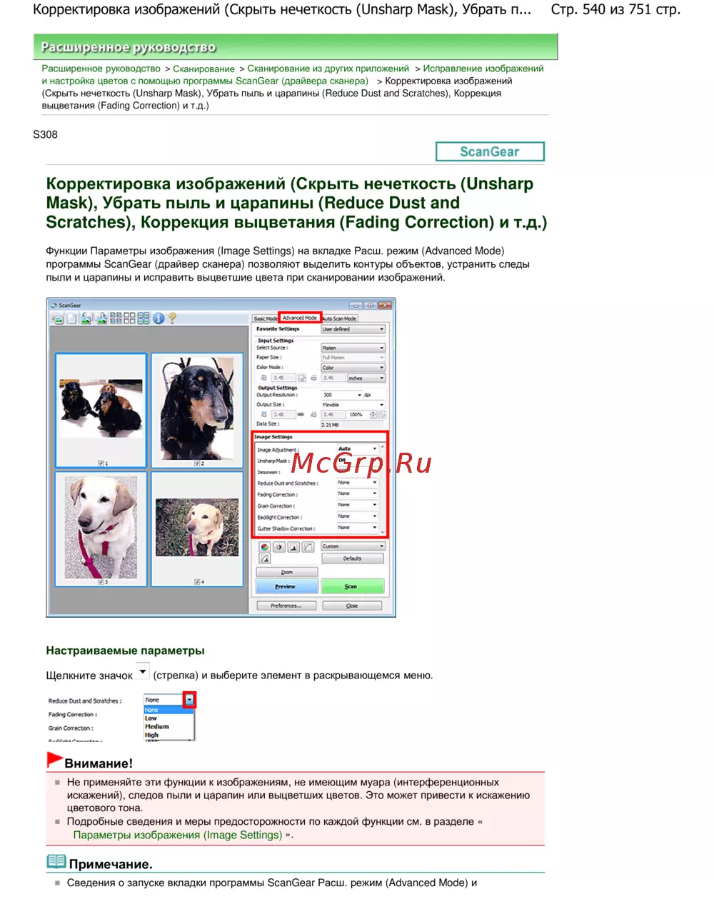 Узнайте, как исправить изображения и настроить цвета с помощью функций программы для сканирования. Подробности о параметрах и мерах предосторожности.