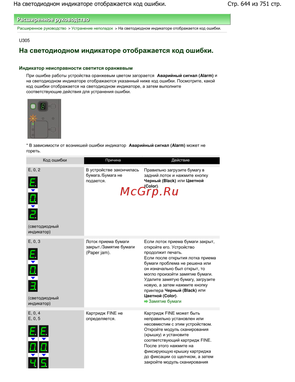 Canon PIXMA MP282 — устранение неполадок: коды ошибок на светодиодном индикаторе [644/751]