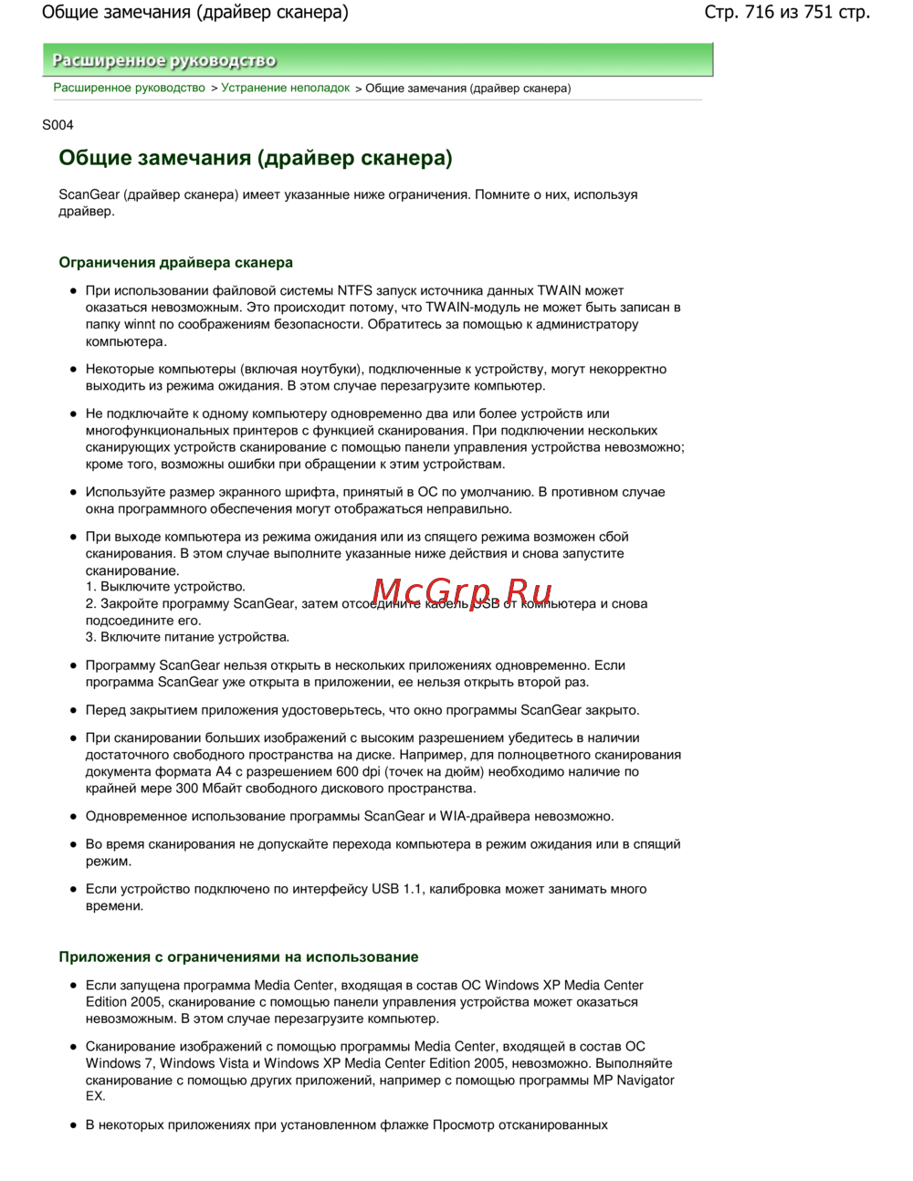 Canon PIXMA MP282 — ограничения драйвера ScanGear: руководство по устранению неполадок [716/751]