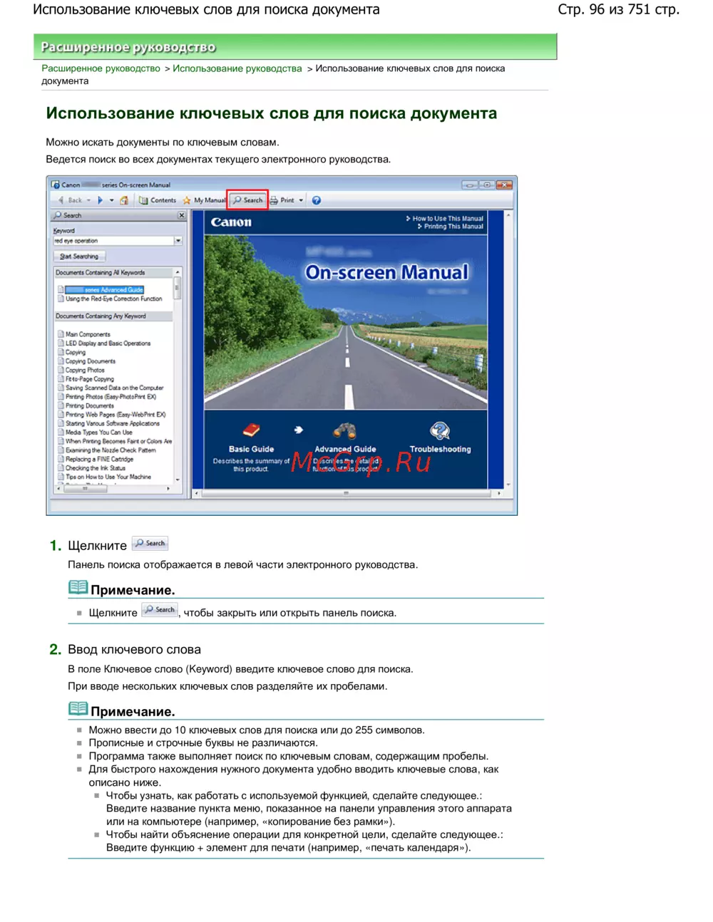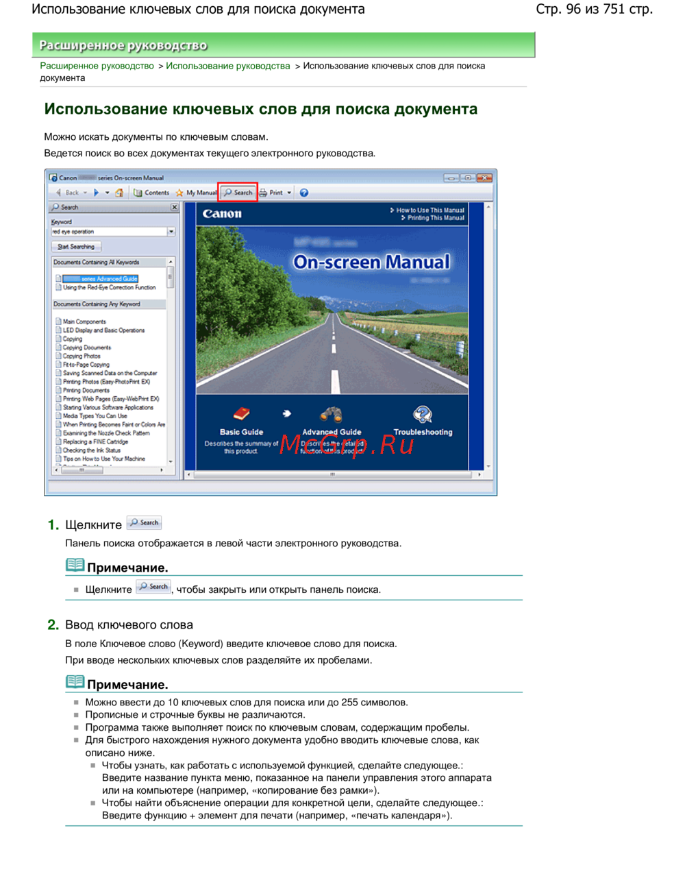 Узнайте, как использовать ключевые слова для быстрого поиска документов в электронном руководстве. Вводите до 10 слов для точного поиска.