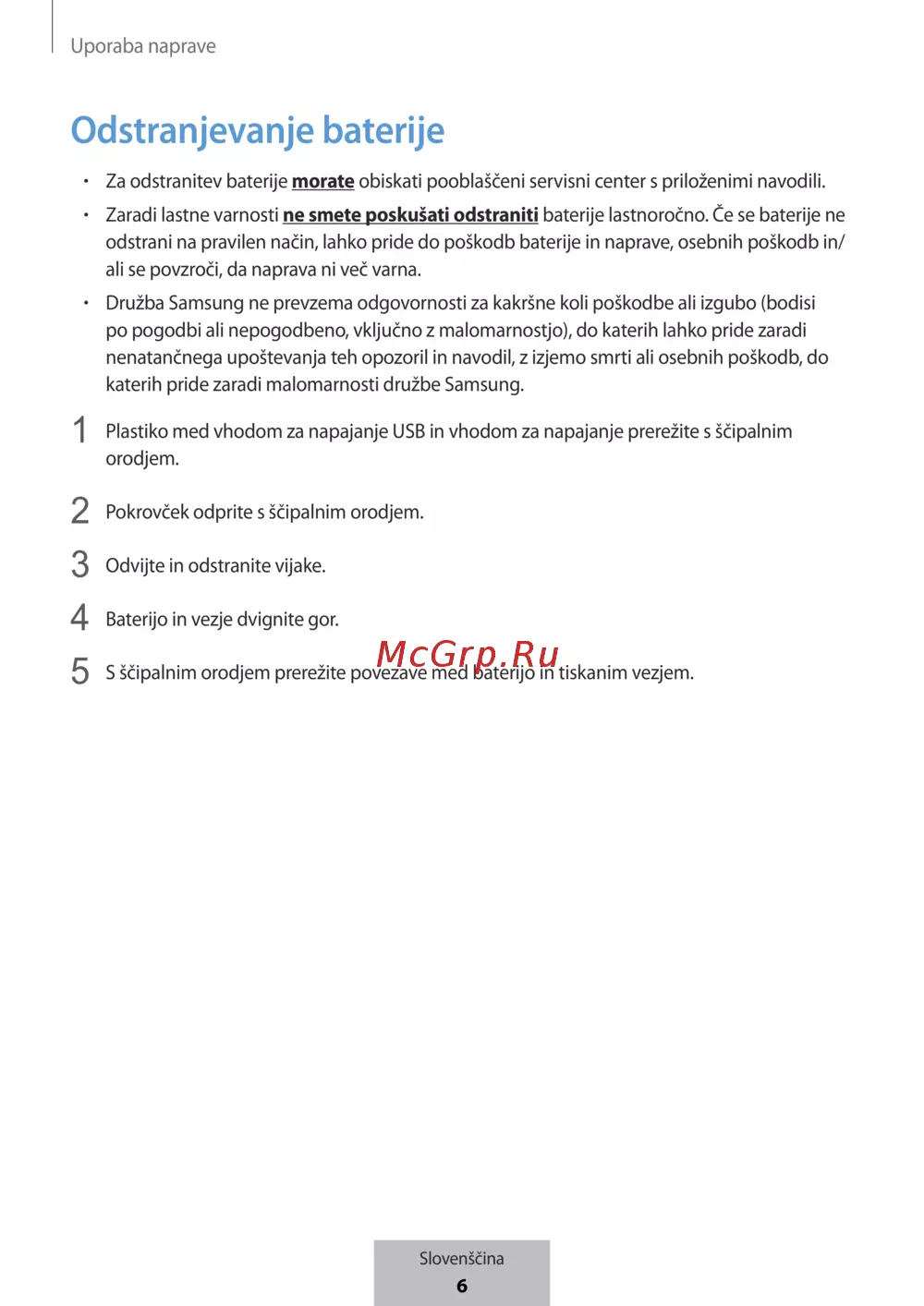 Za odstranitev baterije morate obiskati pooblaščeni servisni center s priloženimi navodili.