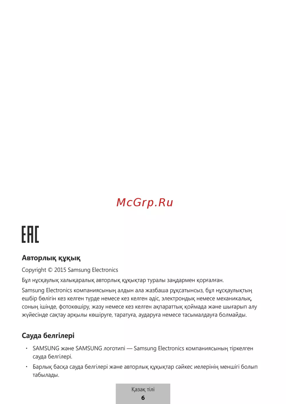 Samsung Electronics компаниясының алдын ала жазбаша рұқсатынсыз, бұл нұсқаулықтың