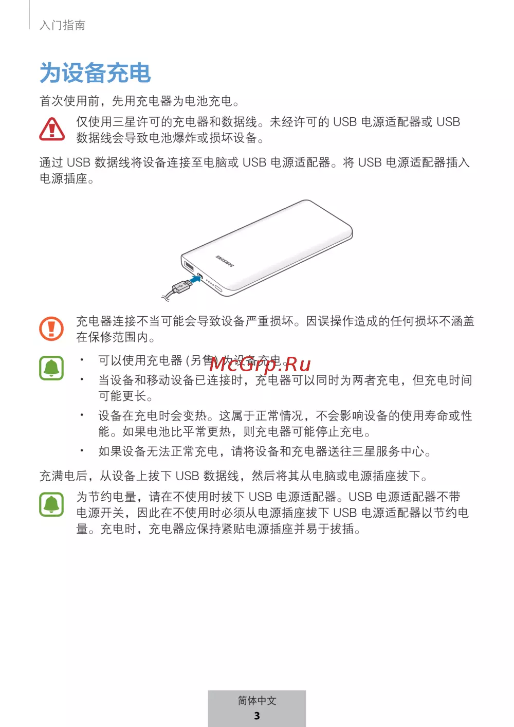 仅使用三星许可的充电器和数据线。未经许可的 USB 电源适配器或 USB