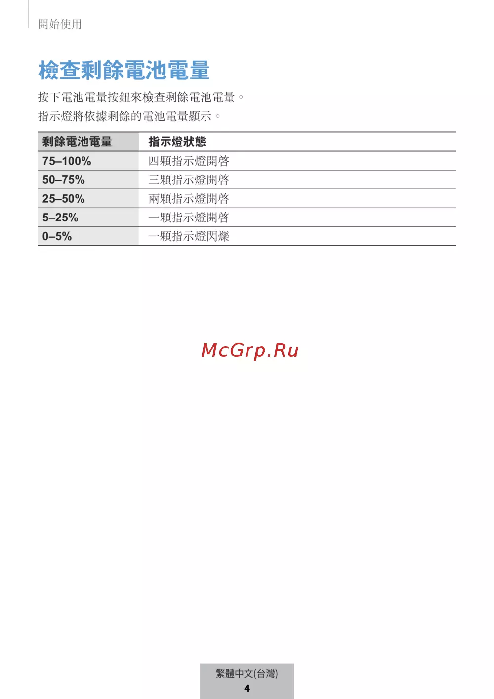 剩餘電池電量 指示燈狀態