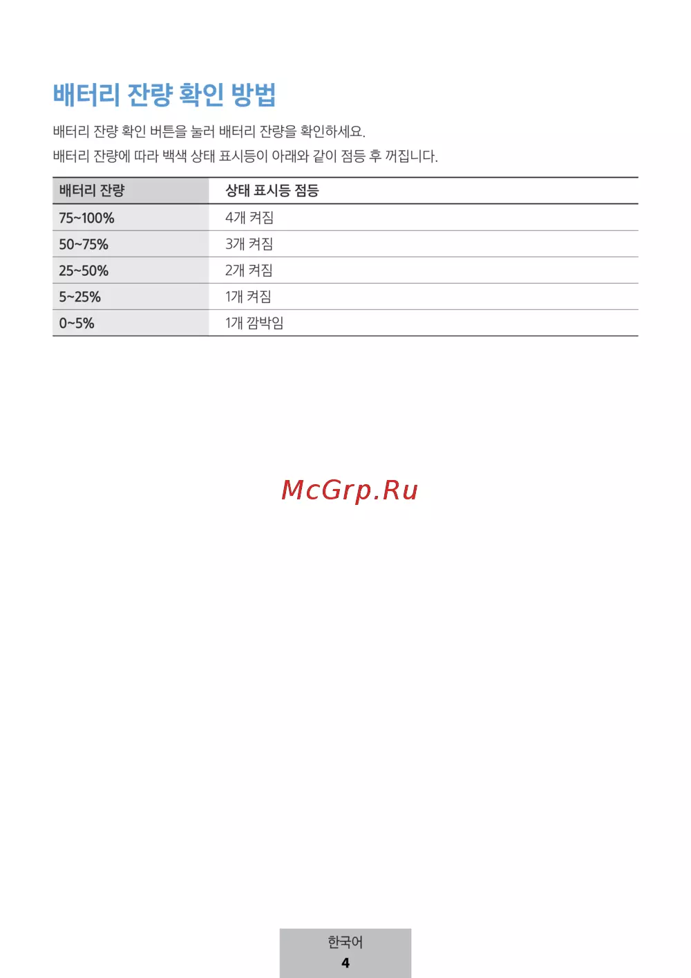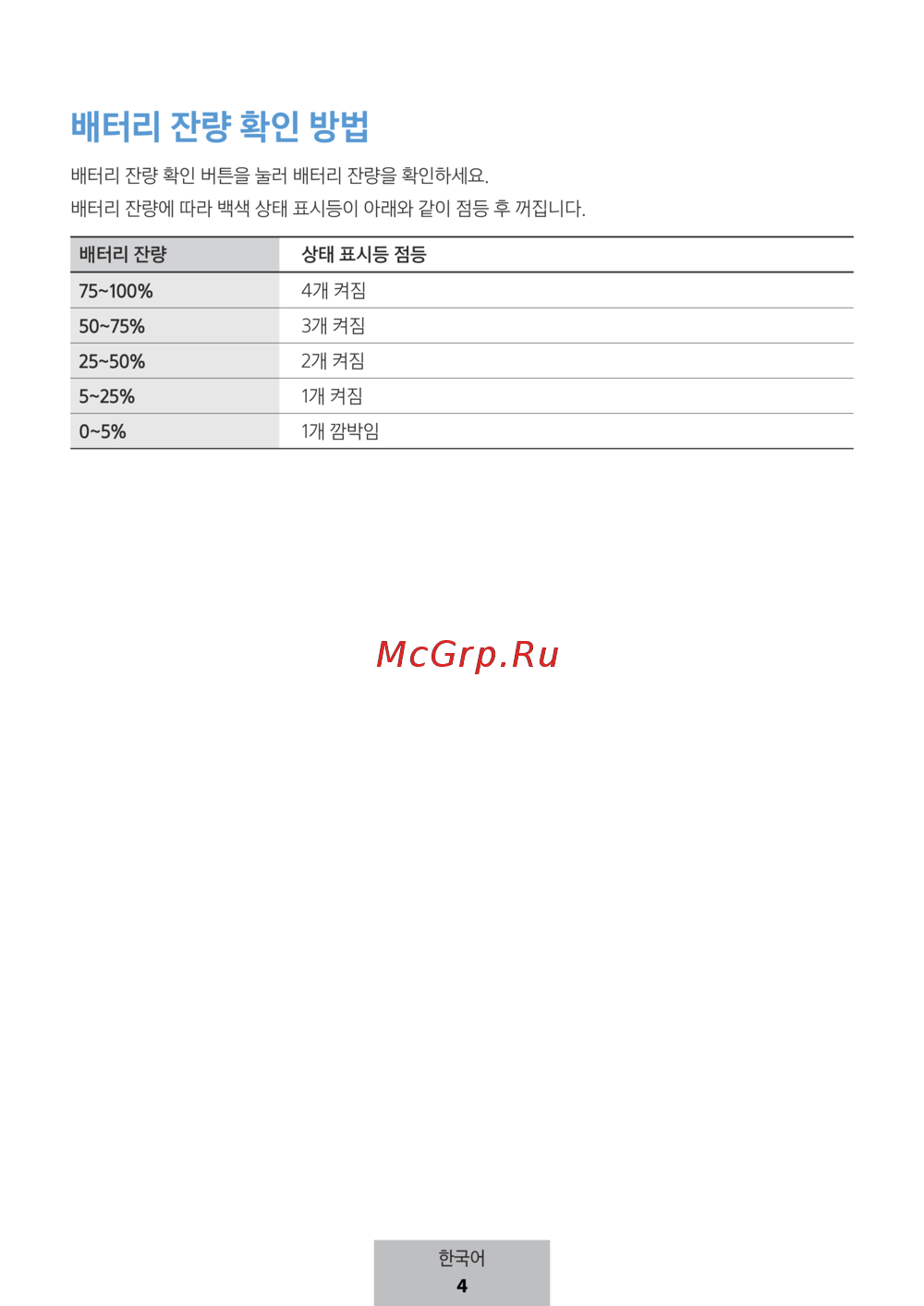 배터리 잔량에 따라 백색 상태 표시등이 아래와 같이 점등 후 꺼집니다.