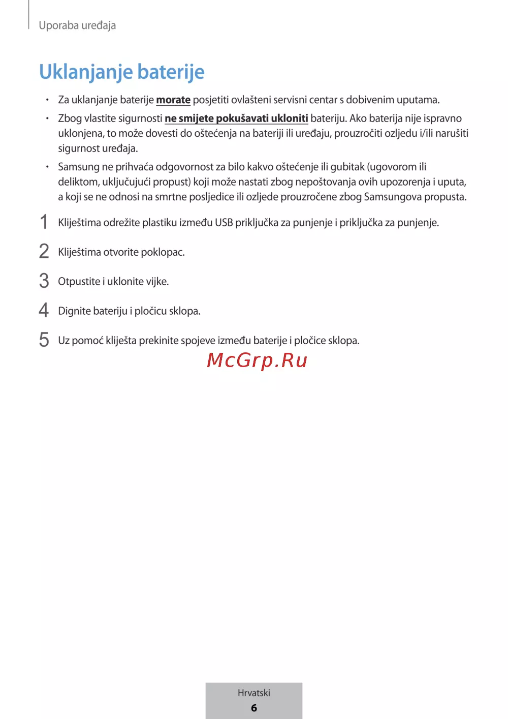 Za uklanjanje baterije morate posjetiti ovlašteni servisni centar s dobivenim uputama.