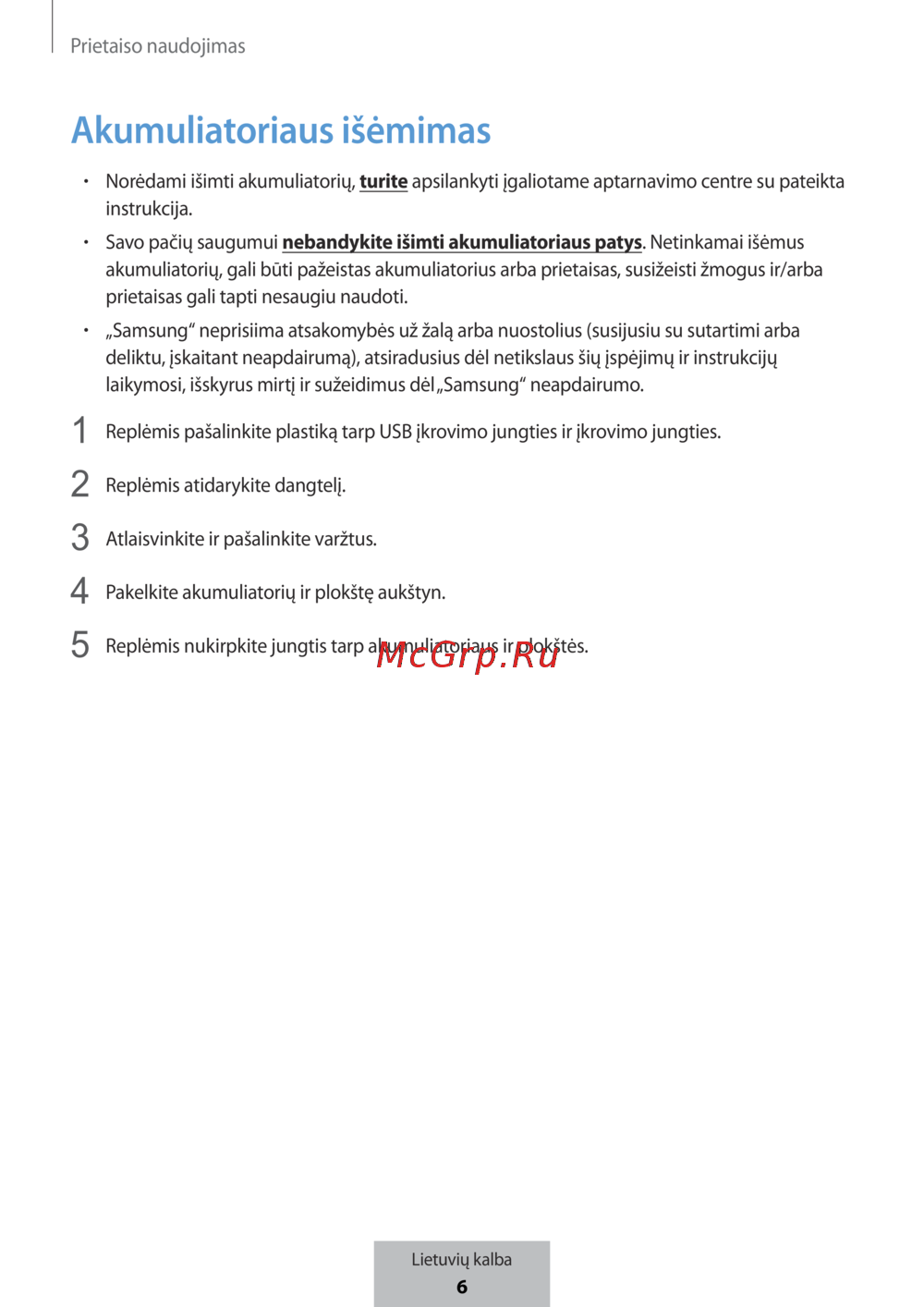 Savo pačių saugumui nebandykite išimti akumuliatoriaus patys. Netinkamai išėmus