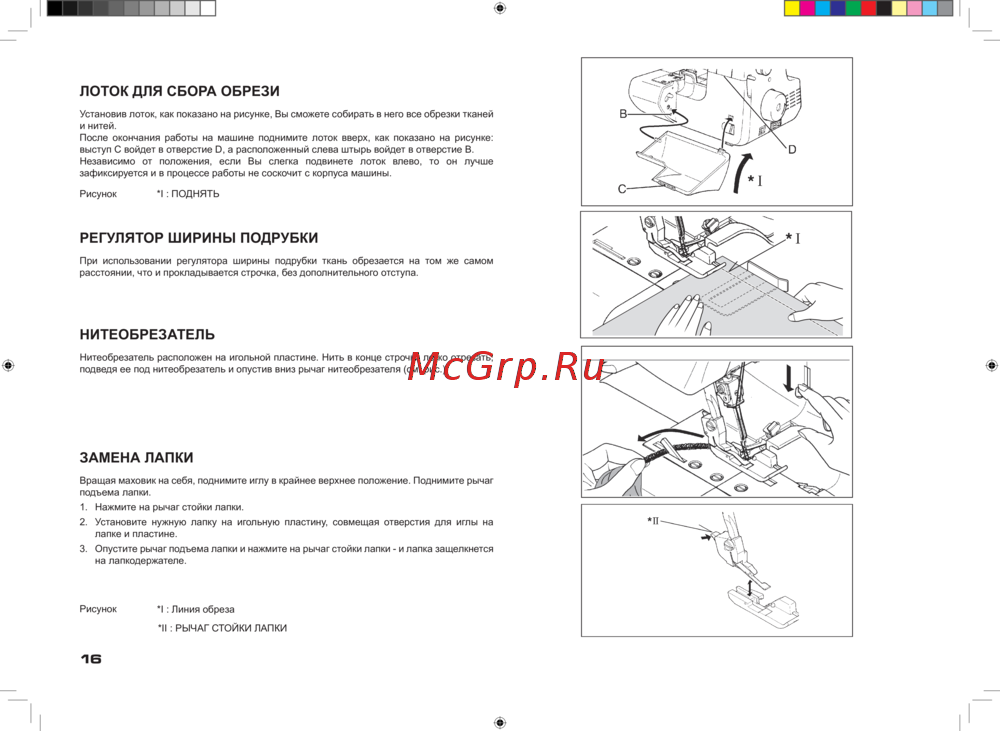 Установив лоток, как показано на рисунке, Вы сможете собирать в него все обрезки тканей
