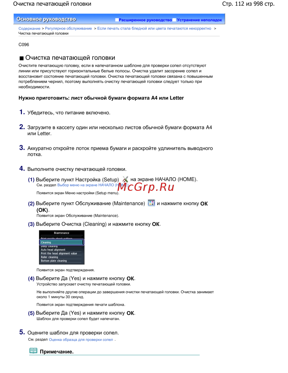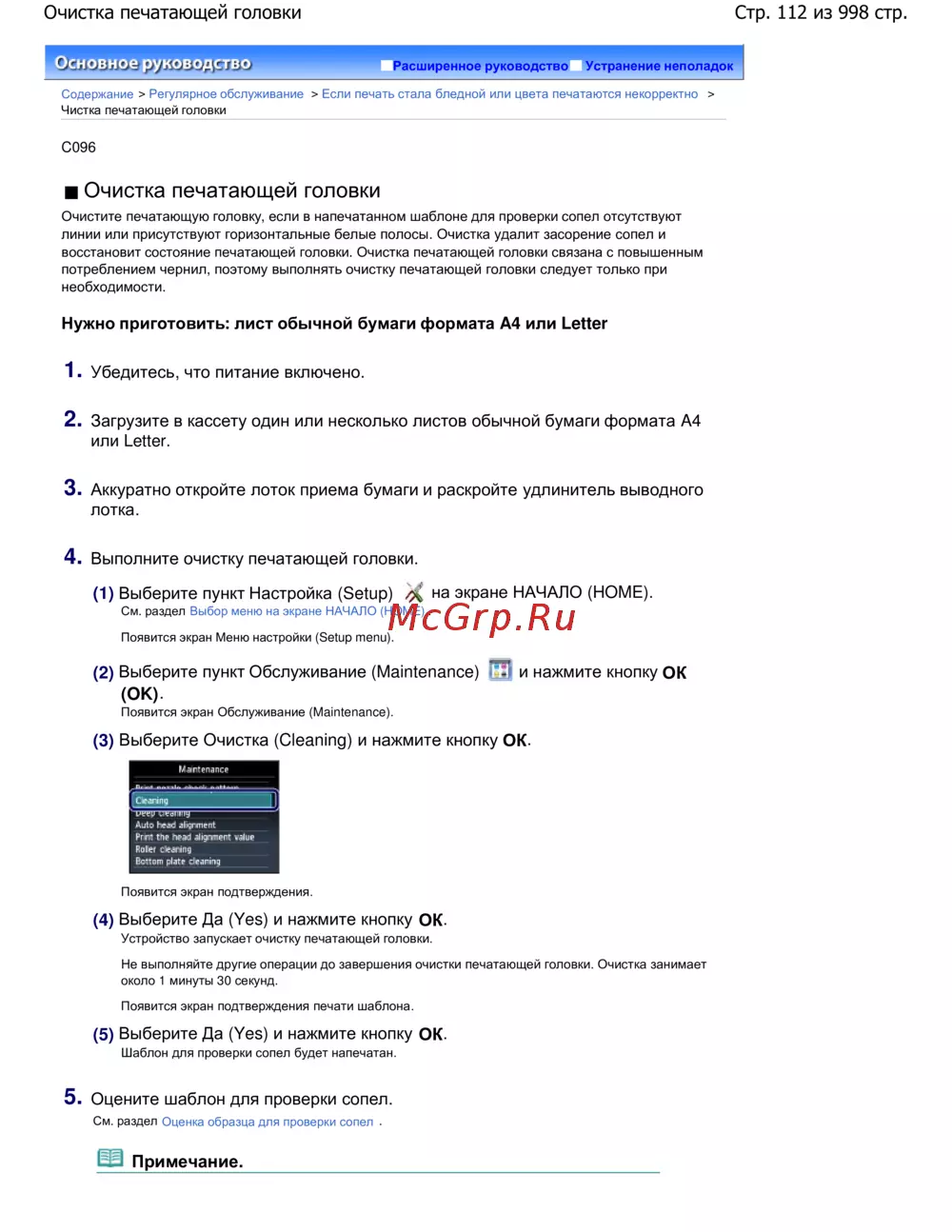 Canon Pixma MG5140 — руководство по чистке печатающей головки принтера — устранение засоров и восстановление цветопередачи [112/998]