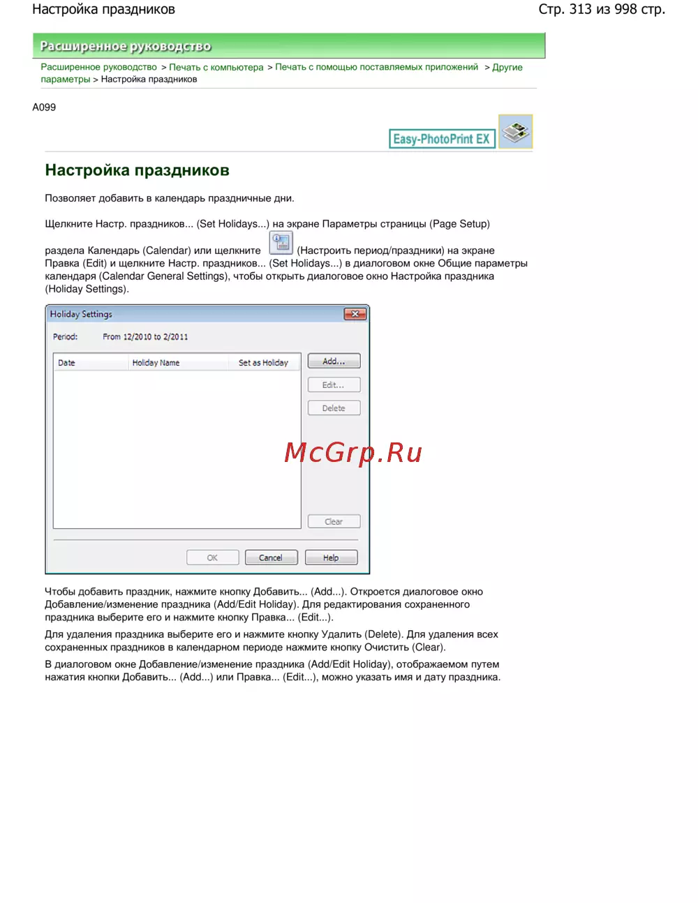Canon Pixma MG5140 — полное руководство по настройке праздничных дней в календаре [313/998]