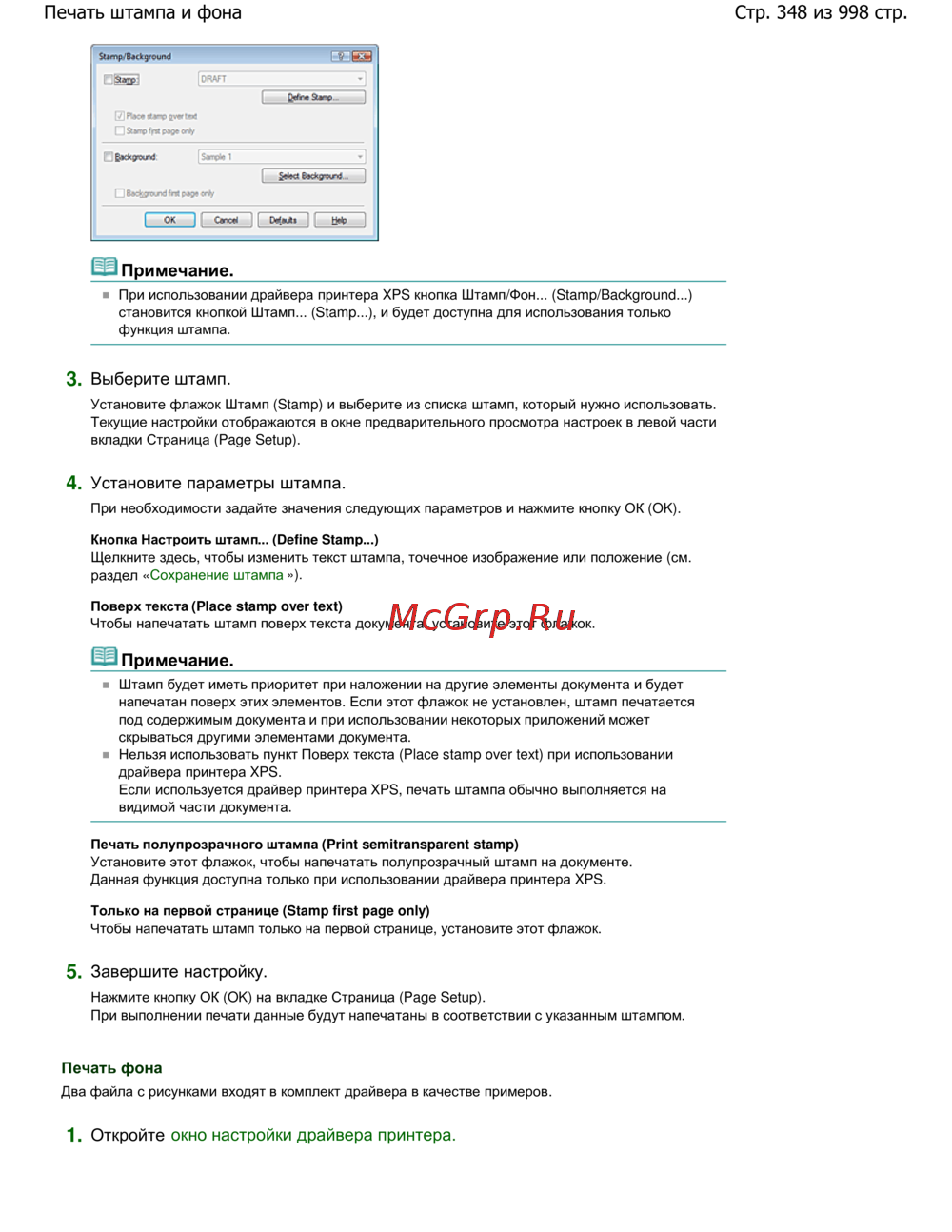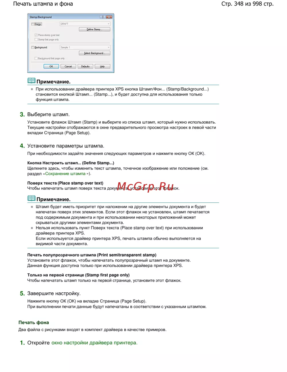 Инструкция по настройке печати штампов и фона в драйверах принтера. Узнайте, как использовать функции штампа, полупрозрачности и настройки для XPS драйверов.