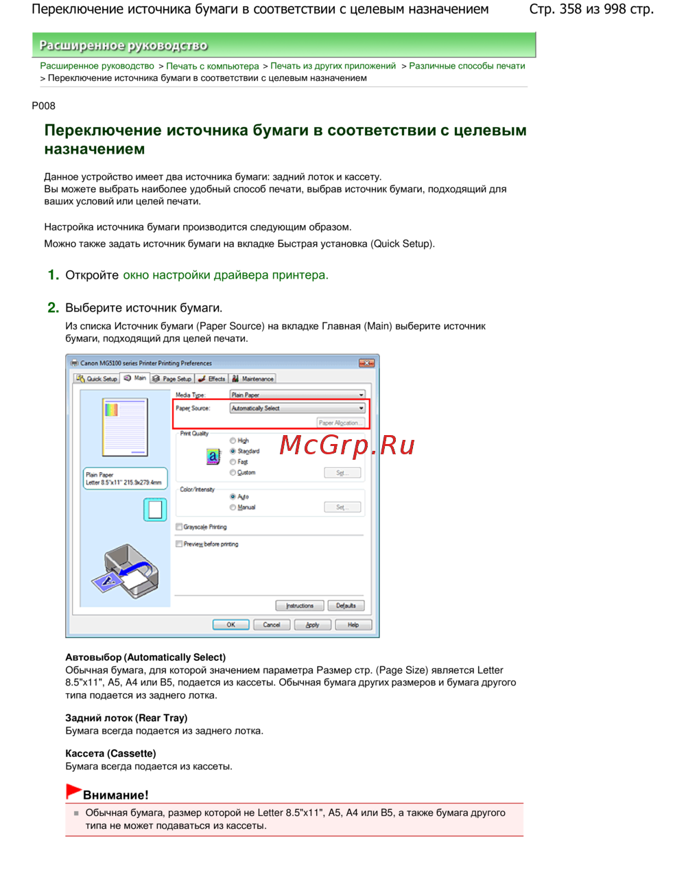 Canon Pixma MG5140 — как выбрать источник бумаги для печати: полное руководство [358/998]