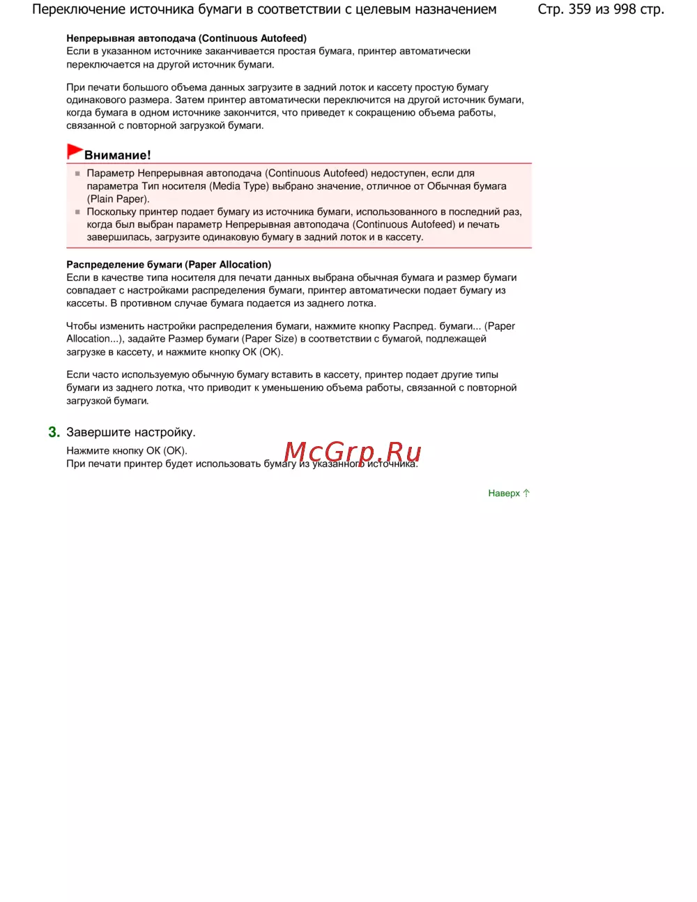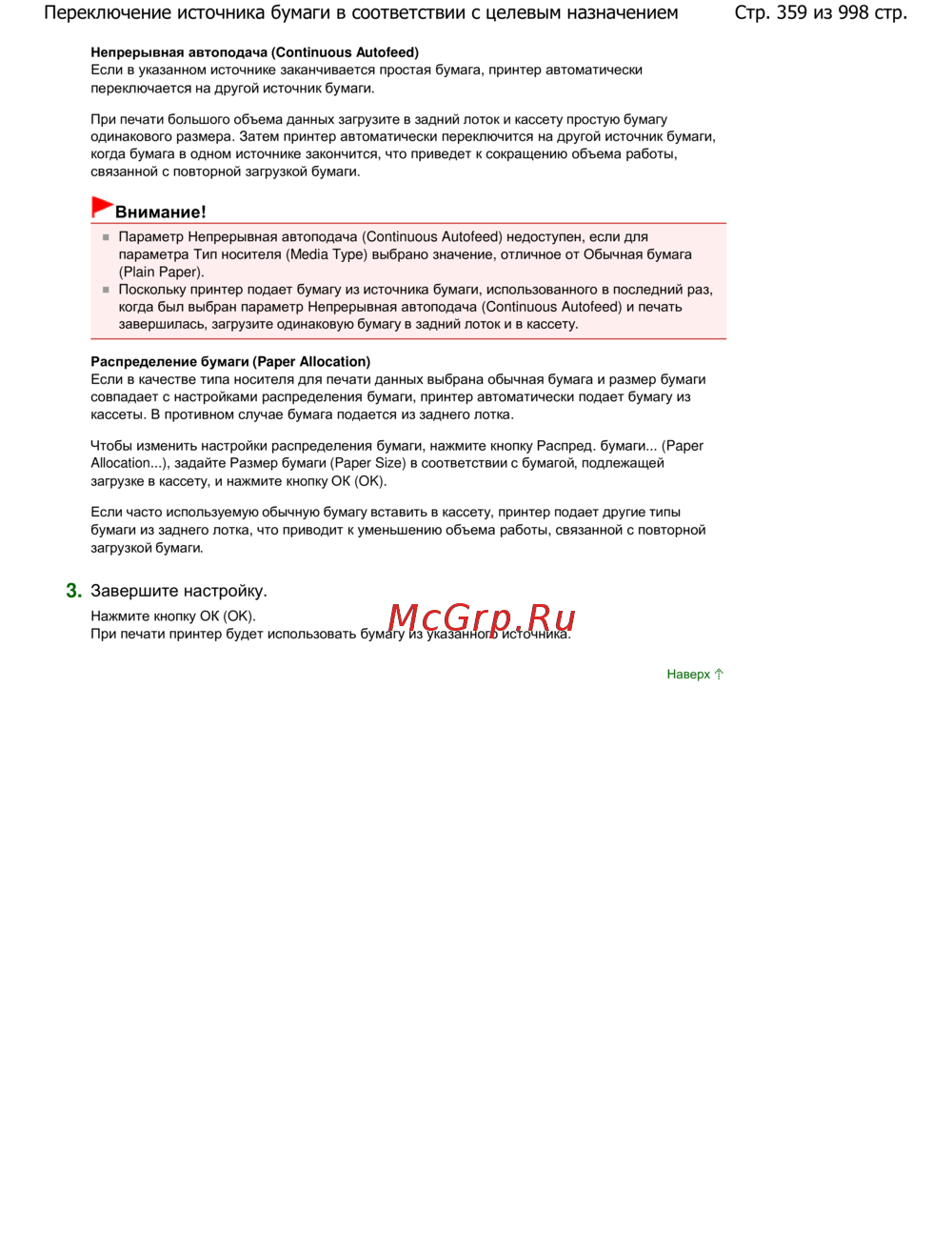 Стр. 359 из 998 стр.Переключение источника бумаги в соответствии с целевым назначением