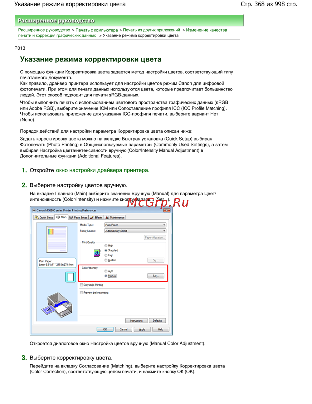 Canon Pixma MG5140 — как настроить корректировку цвета при печати с компьютера [368/998]
