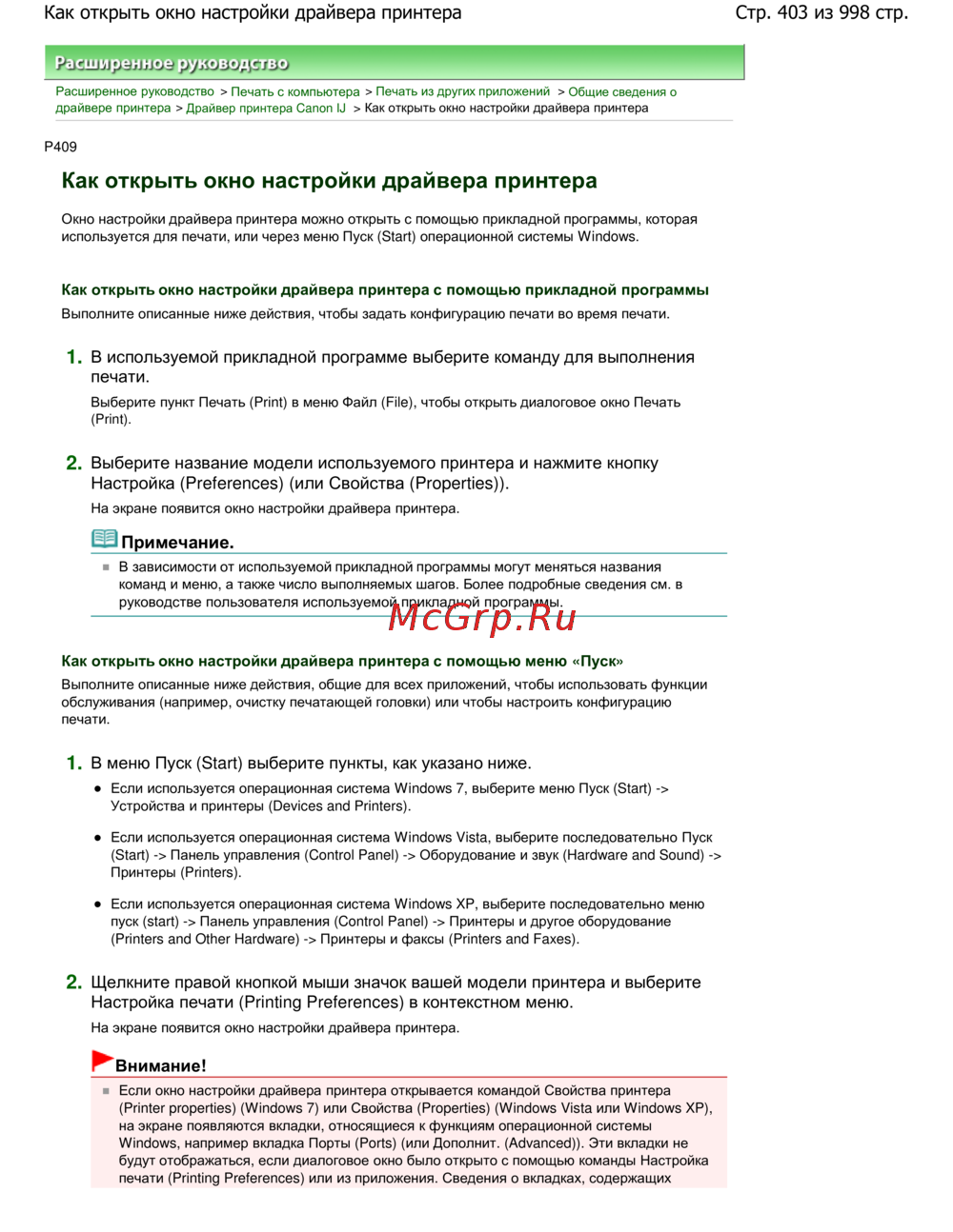 Стр. 403 из 998 стр.Как открыть окно настройки драйвера принтера