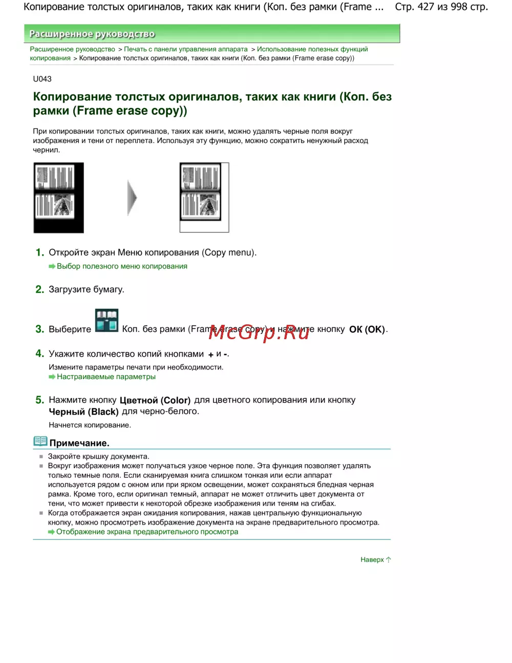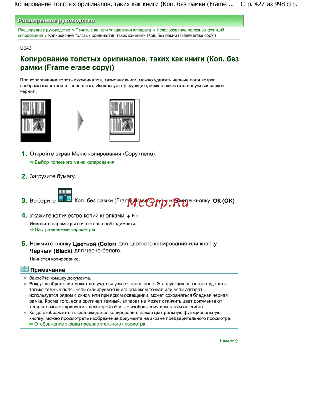 Стр. 427 из 998 стр.Копирование толстых оригиналов, таких как книги (Коп. без рамки (Frame ...